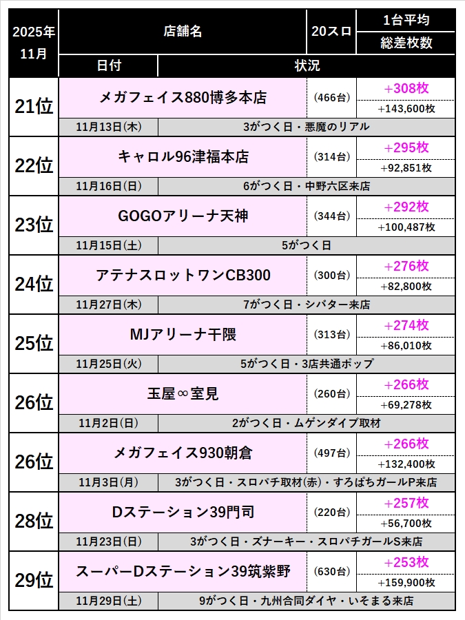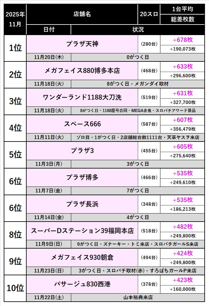 スマスロ導入月になった11月は19開催分のランキング👑玉屋本店の2がつく日が、1位・2位・5位と3開催分ランクインと凄かった。プラザ系列の7がつく日も安定して差枚良きで、今回は5店舗→荒江・博多・長浜・Ⅲ・本店。Dステ飯塚は各特日+リフレッシュで5回が平均+250枚以上👏ほかスマスロ導入のリニュやリフレでのランクインあり。今回の見返し記事は玉屋本店の3記事分。