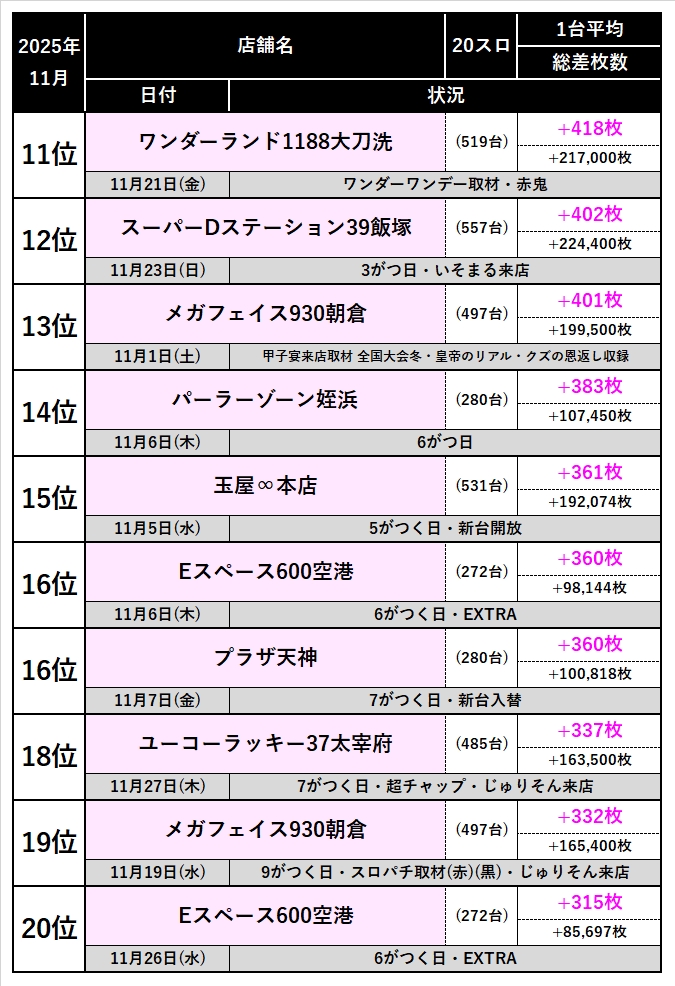 11月のランキング対象は15開催でした。11月って事でワンダー月かと思いきやランクインはゾロ目の香椎本館&Ⅱの2店。流石は旗艦店と言った所ですがちょっと寂しかったかなと。他は引き続きレインボー🌈ポップやプラザ創業日ポップ、シバター来店等の差枚が盛り上がっていました。初見だった「あま王さん🍓狩り」「超りゅーこ」も今後要注目かと思います。見返し記事は1位のテンガイ八女と4位のスタジアム遠賀の2本で!