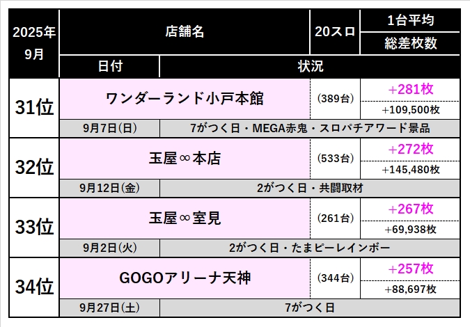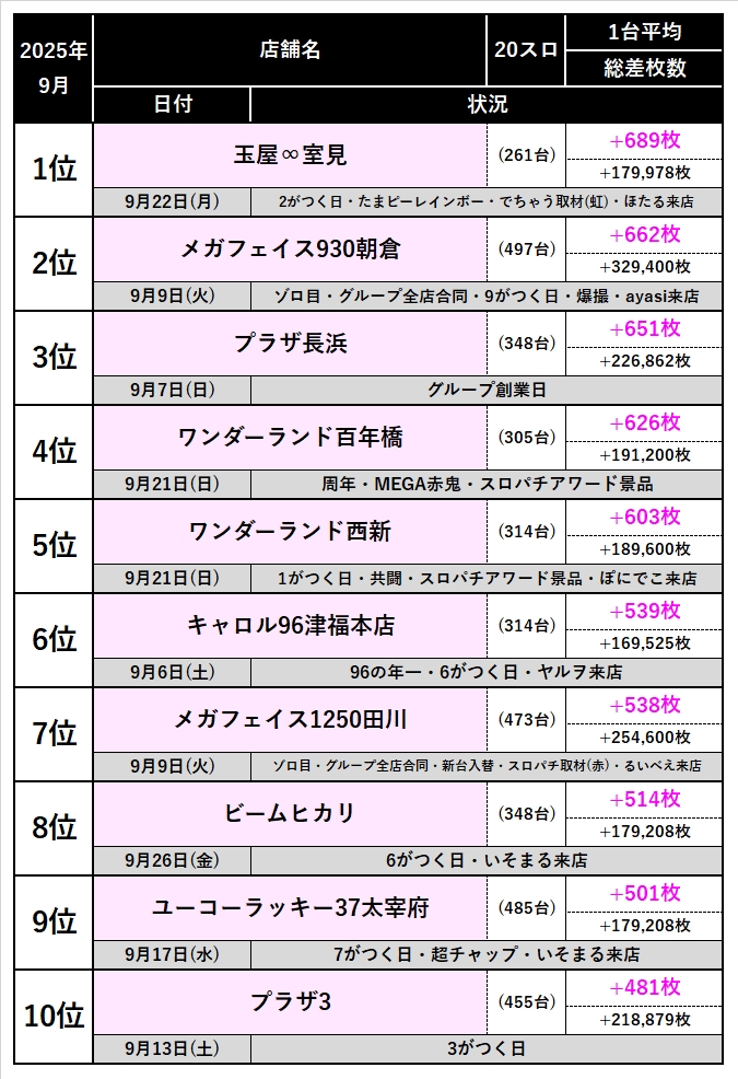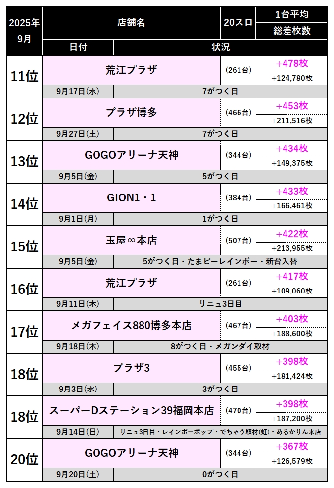 9月は大量42開催分がランクイン!1年かけて創業50周年をアピールしていたプラザ系列がTOP10独占。創業日期間や以降の7がつく日も目立ってました。あとはDステ月で3&9の日やレインボーポップで平均+400枚overが多かった。ほかメガフェイス飯塚や来店絡みのランクイン等。今回の見返し記事はプラザ創業50周年で!