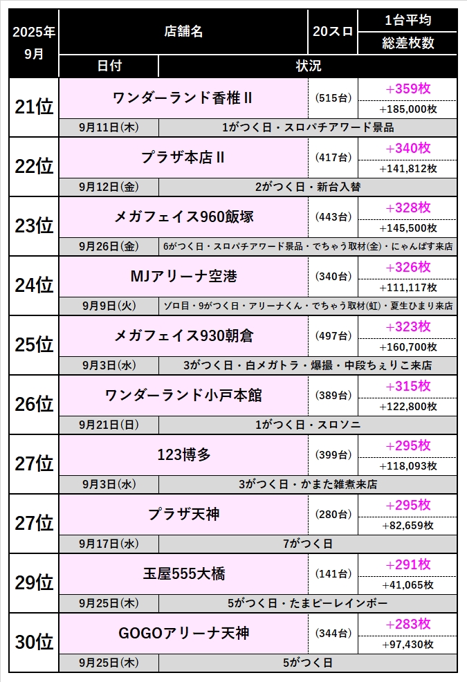 2021年最多の19開催分がランクイン。目を引くのが特日にレインボー🌈ポップを出していたDステ本店&筑紫野とワンダー大刀洗。10月も同様の示唆が出るなら要注目です。グループ創業日で9店舗中2店舗ランクインのプラザ系列も流石でした。ゾロ目は19位中5店舗と出玉での盛り上がりもあった。