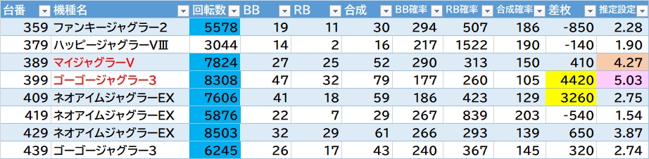 | ゴーゴージャグラー3 | 399 | 8,308 | 4,420 |