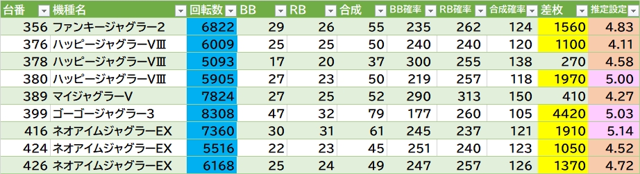 | ネオアイムジャグラーEX | 419 | 5,876 | -540 |