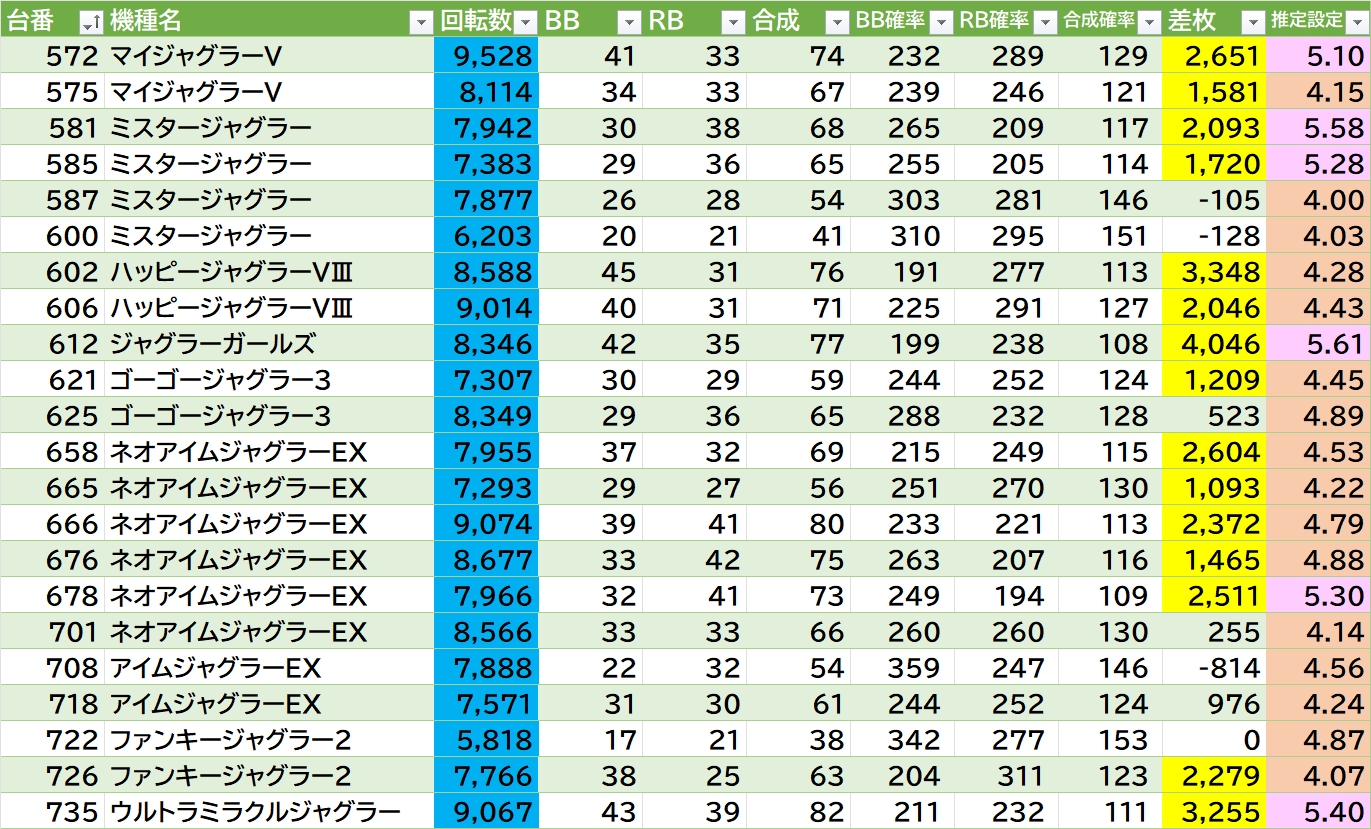 東京喰種・マギレコは半分位良さそう。化物語は535~536番の連番が気になる(2/3台)。北斗シリーズは1/3位〇。モンキーⅤは両角付近が〇(363番+11000枚🎉)。ヴヴヴ2は真ん中寄りで勝率〇。ジャグラーは117台中22台(18.8%)が推定4以上。