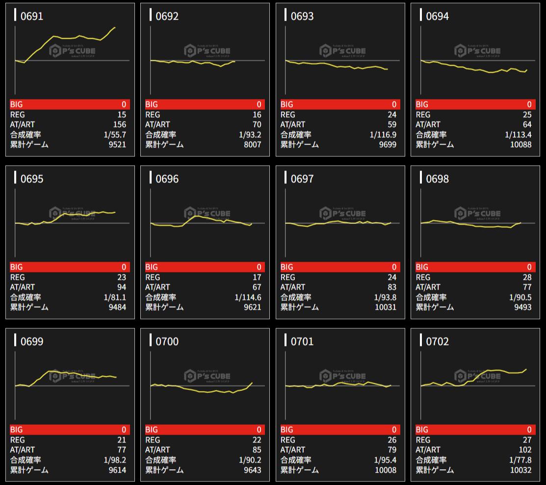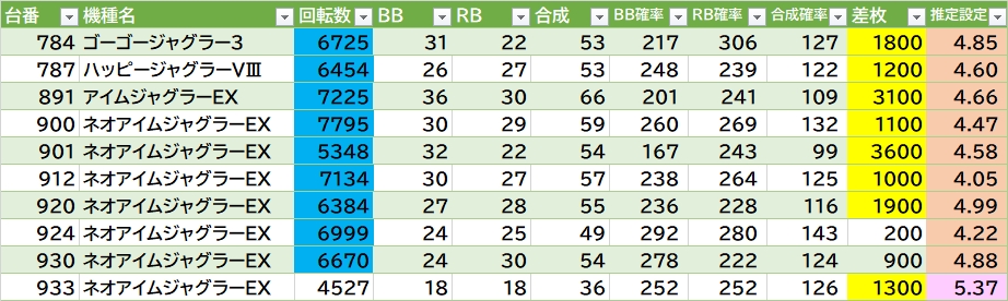 マイⅤが良さげ👉推定4以上42/48台で内28台が5以上。転生2も気になる👉平均9260G 勝率12/22台で万枚over2台🎉特に691~702番側。あとはヴヴヴ2の488~491番が勝率〇。東京喰種・鉄拳6に万枚over1台あり🎉1台機種のダン持ても〇。ジャグラーは137台中52台(38.0%)が推定4以上。