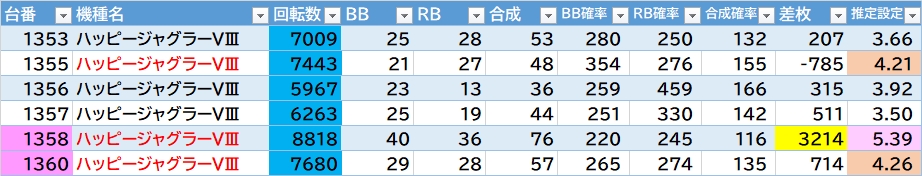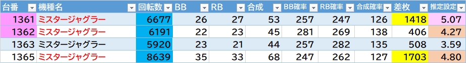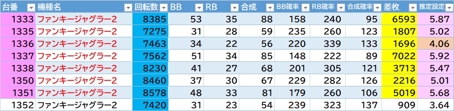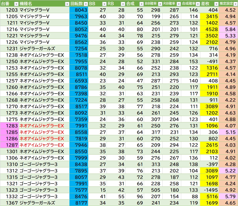 バラエティのL化物語が良さそう👉平均4910G 勝率3/3台。アズレンも気になる(平均5220G 勝率2/2台)。連番で良さそうな所あり▶①転生2の1373~1376番。②マギレコの1561~1562番。③モンキーⅤの1585~1586番。④いざ番長の1603~1606番。あとはからサー・ヴヴヴ2・新鬼3(11台側)の角辺り気になる。鉄拳6は真ん中辺り〇。かぐや様・東リベ・乙女4(バラ)に万枚over1台🎉ジャグラーは110台中44台(40%)が推定4以上。ファンキー2が7/8台で内6台が5以上👏並びにあるハッピー&ミスターの跨ぎも〇。末尾【5】👉1台平均+2530枚 勝率29/39台(74.4%) ジャグ推定4以上8/14台((57.1%)。