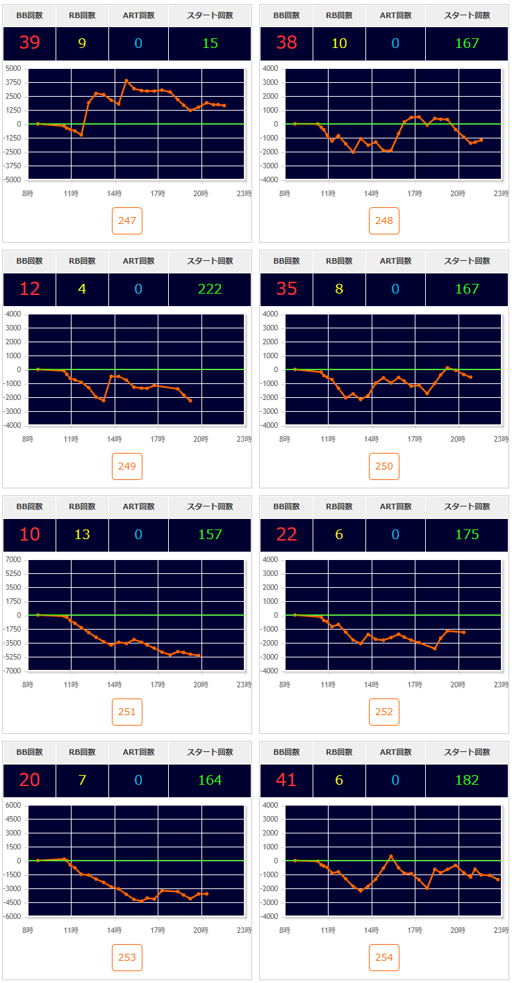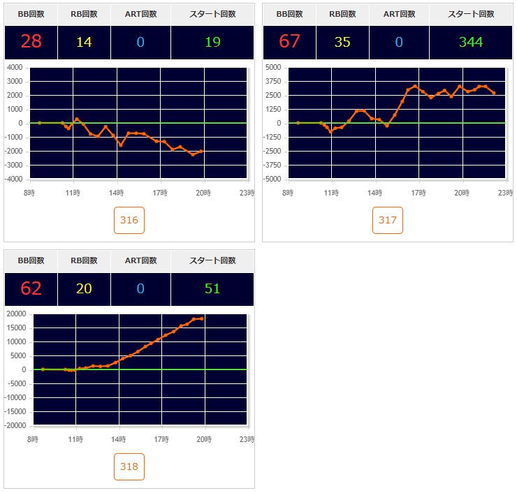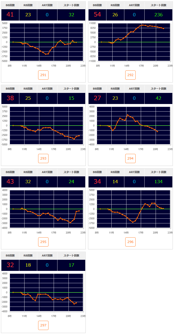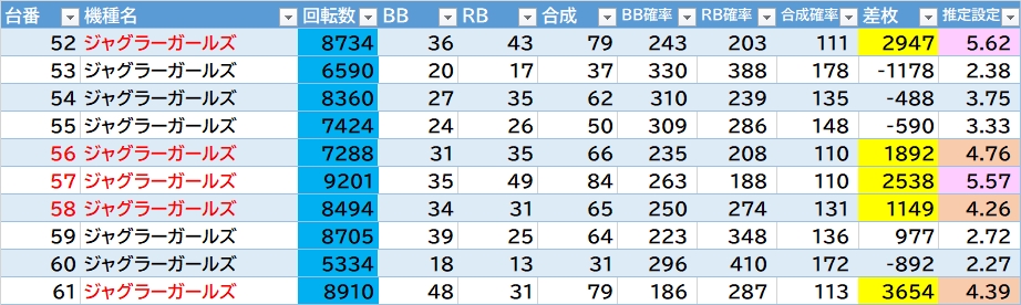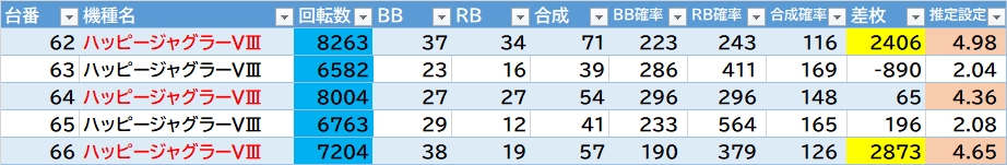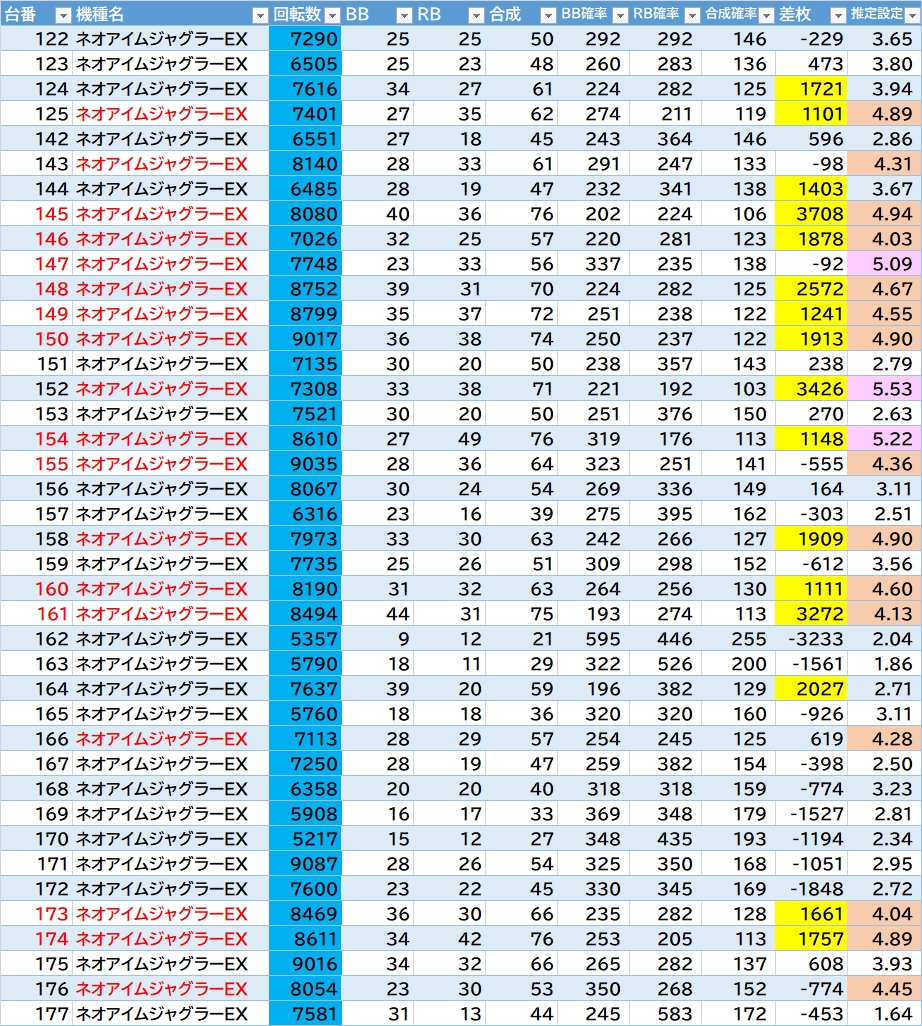 2台機種〇▶①エウレカARTが良さそう。②無職転生・SBJも気になる。③アズレンは万枚over1台あり🎉あとはいざ番長・L秘宝伝が2/3台〇(いざ番長の318番+18100枚🎉)。転生2は概ね1台飛びで良さそう。GEは半分位悪くなさそうな感じ。東京喰種は292~295番辺り〇。ほかカバネリ・モンキーⅤ・1台機種など。からサー・鉄拳6・ヴヴヴに万枚over1台🎉ジャグラーは136台中35台(25.7%)が推定4以上。ハッピーは3/5台で1台飛び。ガールズは5/10台で56~58番の連番〇。ネオアイムは18/40台で143~155番辺り〇。