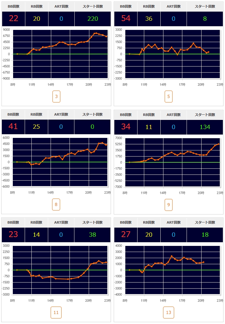 2台機種〇▶①エウレカARTが良さそう。②無職転生・SBJも気になる。③アズレンは万枚over1台あり🎉あとはいざ番長・L秘宝伝が2/3台〇(いざ番長の318番+18100枚🎉)。転生2は概ね1台飛びで良さそう。GEは半分位悪くなさそうな感じ。東京喰種は292~295番辺り〇。ほかカバネリ・モンキーⅤ・1台機種など。からサー・鉄拳6・ヴヴヴに万枚over1台🎉ジャグラーは136台中35台(25.7%)が推定4以上。ハッピーは3/5台で1台飛び。ガールズは5/10台で56~58番の連番〇。ネオアイムは18/40台で143~155番辺り〇。