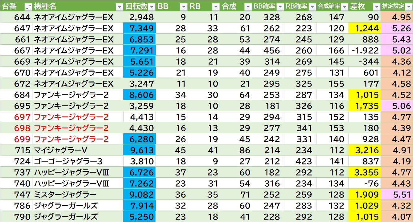 2台機種▶①L化物語・防振りが良さそう(L化物語の631番+16900枚🎉)。②炎炎も悪くなさそうな感じ。③1台良さそうな所も多め(シンフォ正義・イニD2・いざ番長・バイオ5・SBJ・新鬼2・新ハナビ・レールガン2・LBヱヴァ・LBクレア・MFC覚醒)。あとは吉宗も気になる(平均4790G 勝率3/3台)。カバネリ・新鬼3・ヴヴヴ・ToLOVEるは半分位〇。L北斗は877~879・888~889番の連番〇。ほか転生2・ヴヴヴ2など。鉄拳6の608番+12000枚🎉1台機種のグランベルム・ファミスタ・ゲッタマも良さそう。ジャグラーは130台中19台(14.6%)が推定4以上。