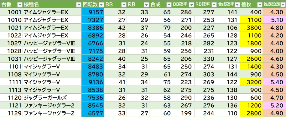 スマスロ北斗・いざ番長が扱い良さそう👏▶①スマスロ北斗は平均5334G(10/10台)。②いざ番長は平均7494G(2/3台)で911番+16600枚🎉あとは東リベの921~922番・926~930番辺りがG数高め。ライズは片角付近が気になる。東京喰種は1台飛びで差枚〇。ヴヴヴの1724番+12400枚🎉ほかGE・かぐや様など。バラはLB機種辺りが気になる。ジャグラーは76台中14台(18.4%)が推定4以上。