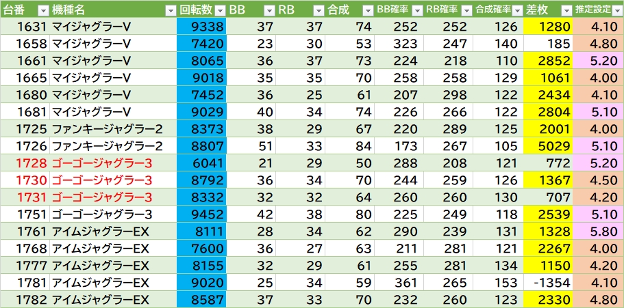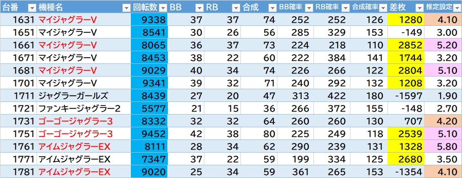アイムジャグラーEX | 1781 | 9,020 | -1,354 |