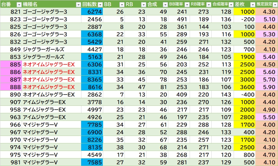 スマスロ北斗の986~991番が良さげ。モンキーⅤの936~940番辺りも気になる。ジャグラーは100台中21台(21%)が推定4以上。ネオアイムの886~888番が推定5以上の連番👏