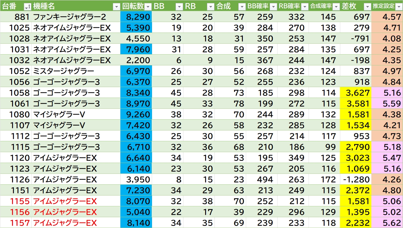 いざ番長の角側が良さげ(653番+15800枚🎉)。モンキーⅤは半分位〇。新鬼3・東京喰種・東リベは1/3位気になる。L北斗は片側寄りで単品ありそう。ジャグラーは98台中20台(20.4%)が推定4以上。アイムの1155~1157(角)番が5以上の連番👍
