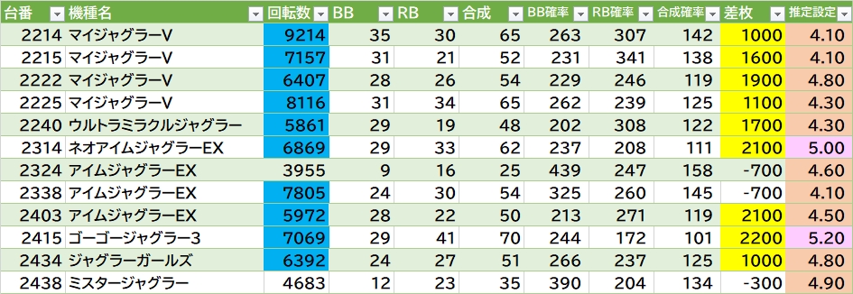 銭形5が平均7481G 勝率2/2台。キンハナは902~904・908~913番が良さげ。東京喰種の内側3台も良さそう。ほかにも連番で気になる所多かった▶①新鬼3の1133~1135番。②からサーの1002~1004番(1004番+10900枚🎉)。③マギレコの816~817番。④ヴヴヴの1013~1014番(1013番+11300枚🎉)。⑤L北斗の1114~1115番。あとはモンキーⅤ・乙女4・アズレンに万枚overあり🎉ほかかぐや様・吉宗・GEなど。ジャグラーは120台中12台(10%)が推定4以上。