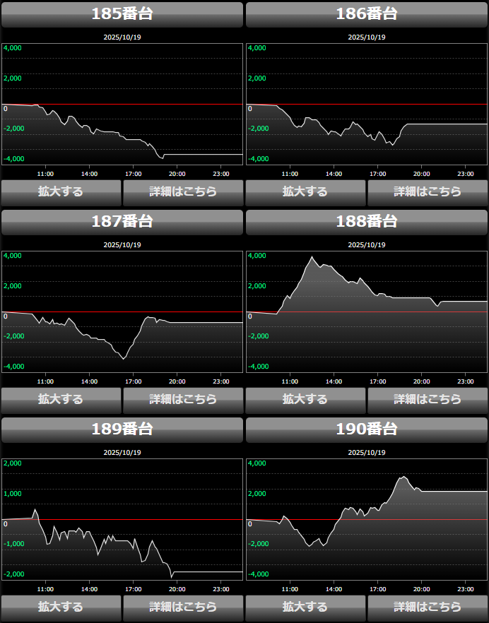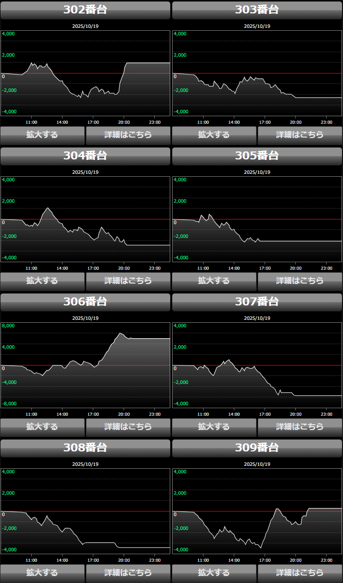 東リベは内側3台良さそう。L北斗は2/3台〇。ヴヴヴは半分位気になる。GEは端側3台が悪くなさそう。マギレコは199番+12200枚🎉&角203番も〇。かぐや様は角端辺り〇。東京喰種・モンキーⅤは1/3位(東京喰種の293番+11300枚🎉)。他からサー・いざ番長・バラエティなど。ジャグラーは109台中11台(10.1%)が推定4以上。