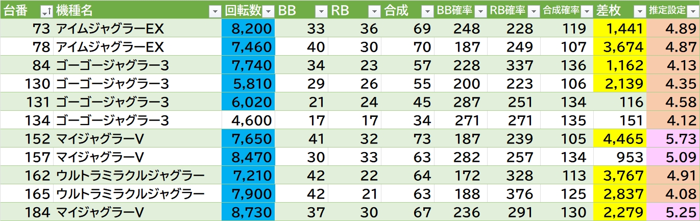 アイムジャグラーEX | 73 | 8,200 | 1,441 |