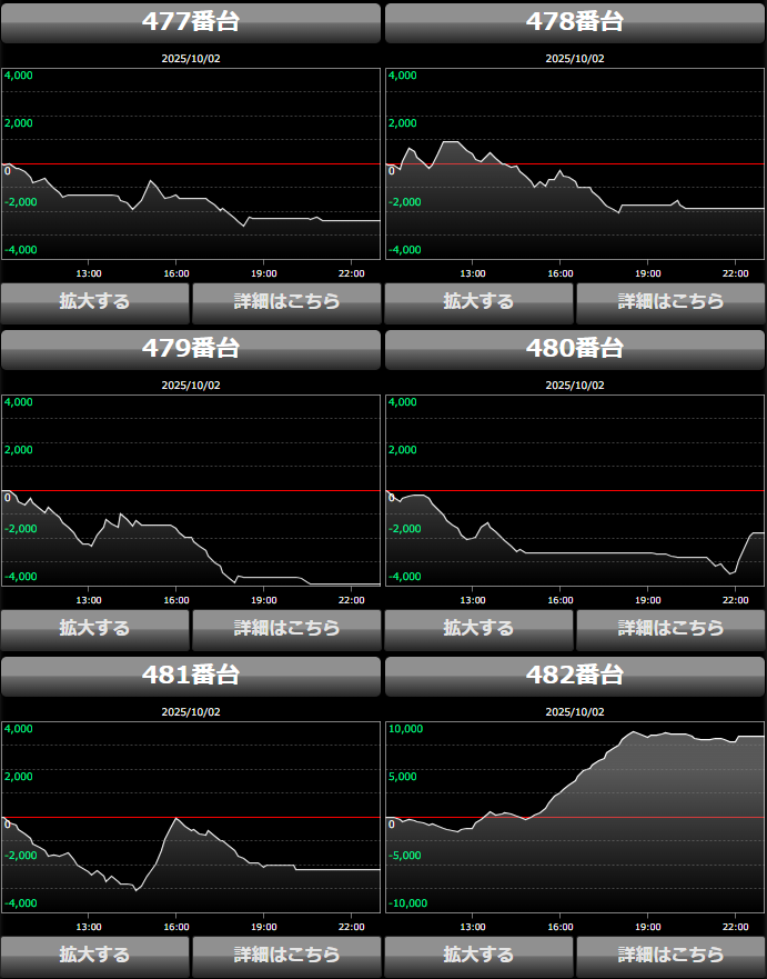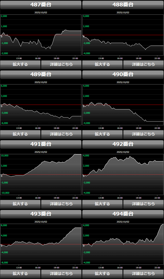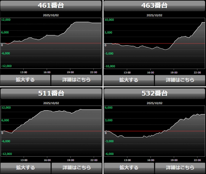 モンキーⅤが扱い良さそうで491~499番辺り👍いざ番長は542~543番の連番〇。東リベは勝率高めで551~553番の連番気になる。ディスクURは半分位〇。東京喰種は各側の真ん中辺り〇。1台機種も良さそうな台多め。ジャグラーは100台中21台(21%)が推定4以上。305~324番列(マイ・ファン・ゴー列)は2~3台の連番あり。ネオアイムも悪くなさそう。