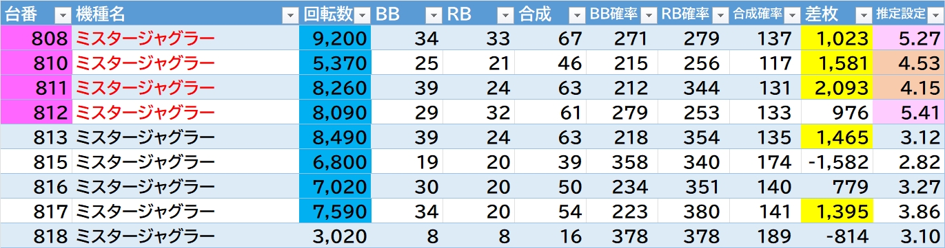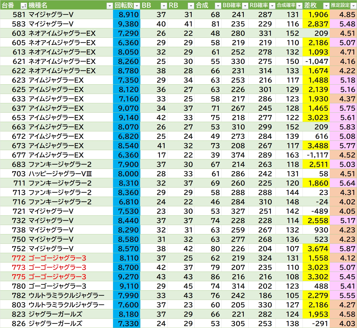 機種名 台番 G数 差枚