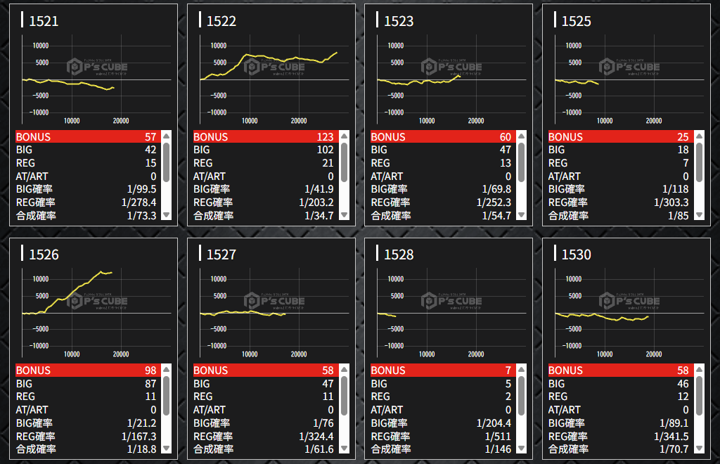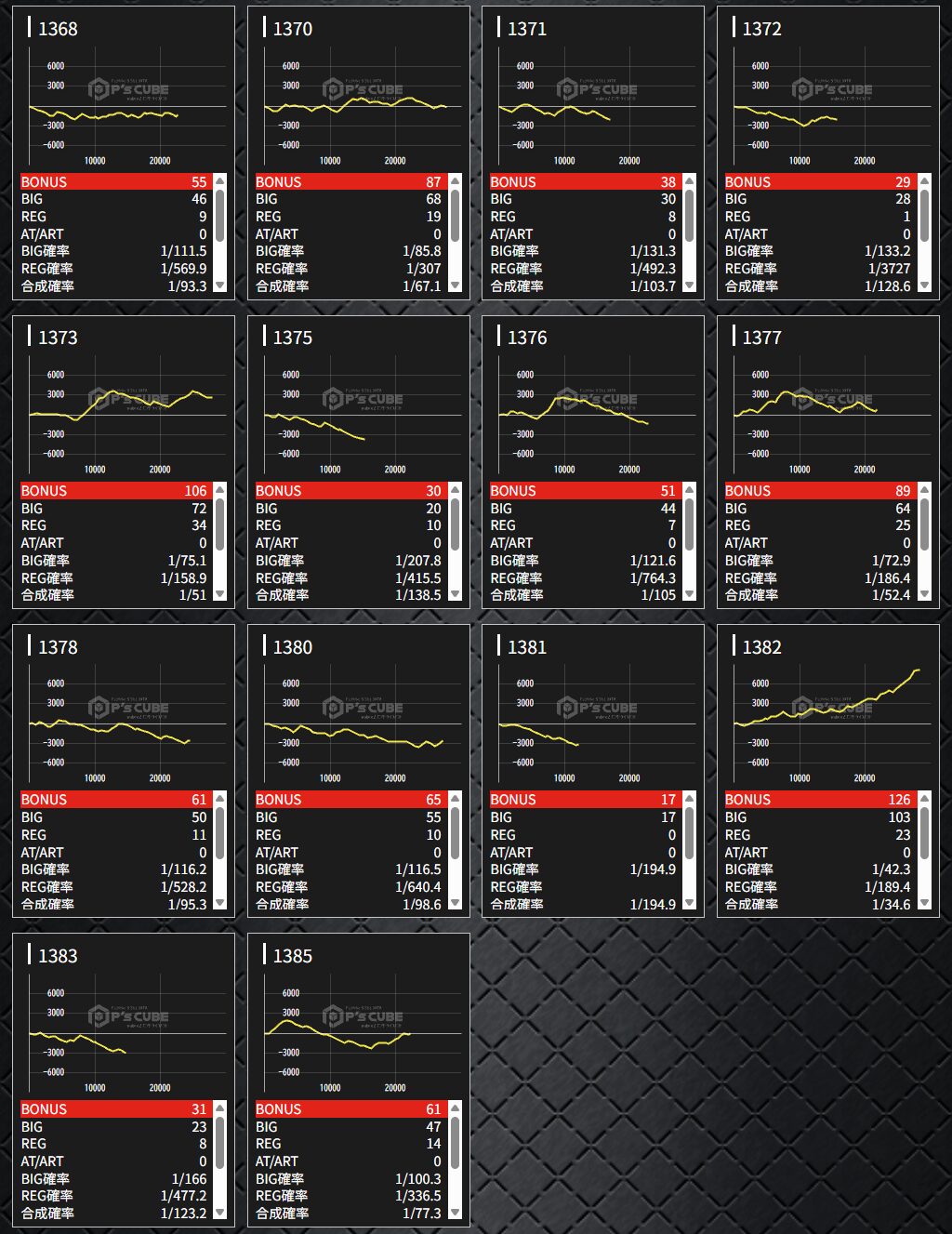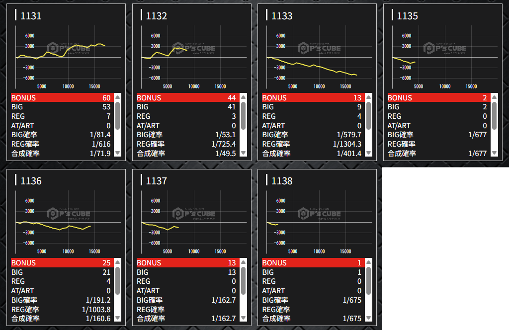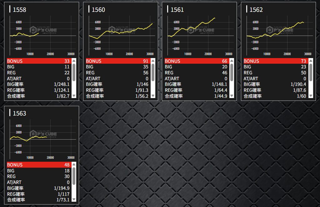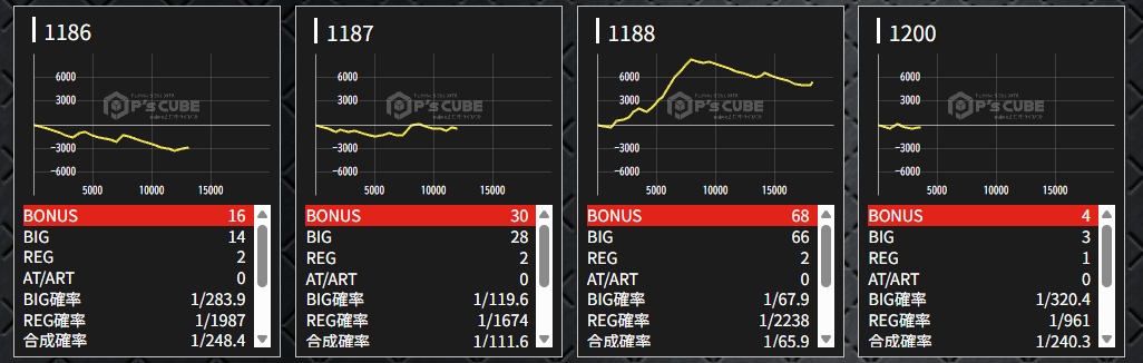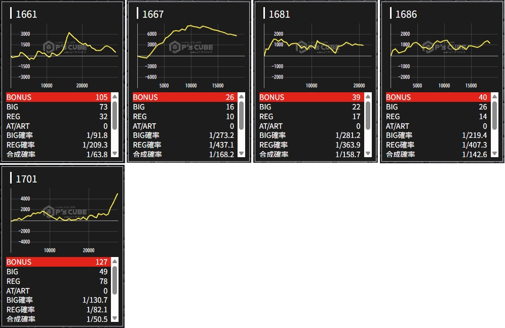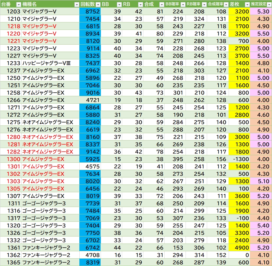 マギレコは内側3台が気になる。からサー・番長4は両端辺り〇(からサーの1153番+12600枚🎉)。ほか新鬼3・ヴヴヴなど。GEの1526番+12300枚🎉バラコーナーは1台機種ゴジエヴァ良さそう。ジャグラーは110台中35台(31.8%)が推定4以上。ネオアイム&アイム列に連番あり。末尾【1】👉1台平均+1125枚 勝率25/40台(62.5%) ジャグ推定4以上7/14台(50%)。
