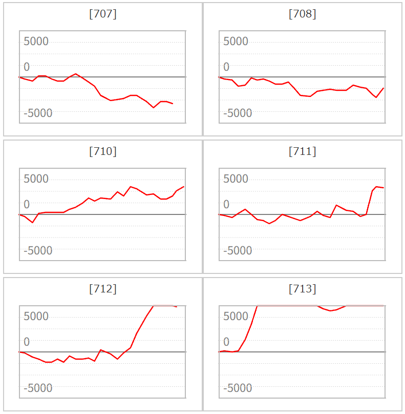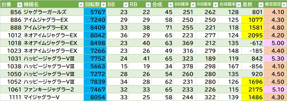 バラコーナーの番長ZEROが良さそう。銭形5は2/3台気になる。ヴヴヴの片角・東リベの角側が勝率高め(ヴヴヴは万枚over3台あり🎉)L北斗は612~615番の連番良さそう。ライズの630~631番・マギレコの638~650番の連番も〇。GEは角端台〇。ほかかぐや様・モンキーⅤなど。新鬼3の665番+11600枚🎉ジャグラーは100台中12台(12%)が推定4以上。