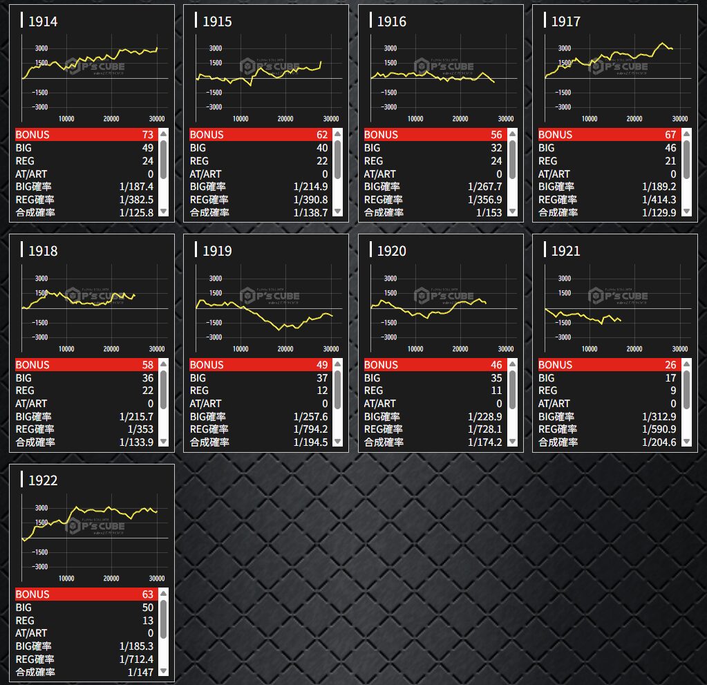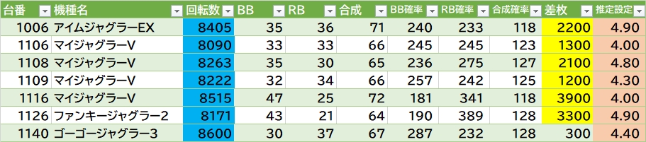 からサーの扱いが良さそう👉平均8460G(10/14台)で1712番+10300枚🎉あとは連番で気になる所多め▶①東リベの角付近922~925番。②ライズの片角辺り1401~1404番。③GEの真ん中辺り1512~1515番(1515番+10800枚🎉)。④マギレコの端1604~1606番。⑤かぐや様の真ん中辺り1617~1620番。⑥ドラハナの片角辺り1914~1918番。ほかいざ番長・キンハナ・バラエティなど。ヴヴヴの角1726番+14400枚🎉ジャグラーは76台中7台(9.2%)が推定4以上。