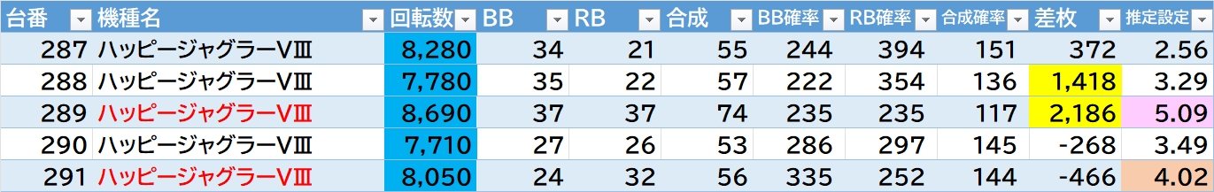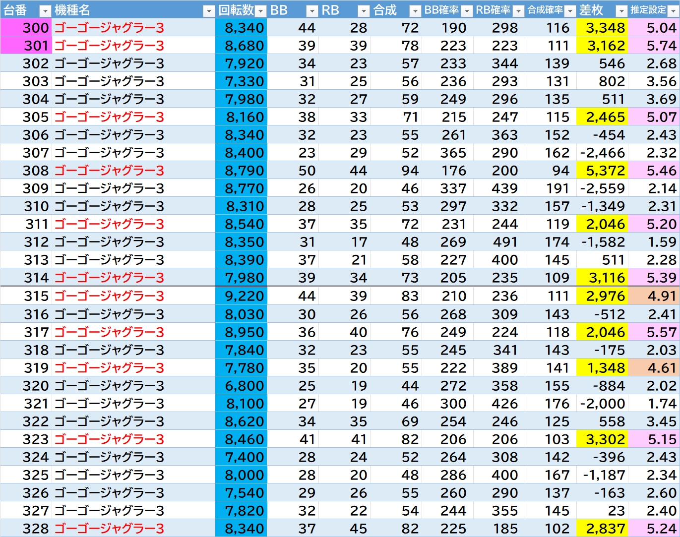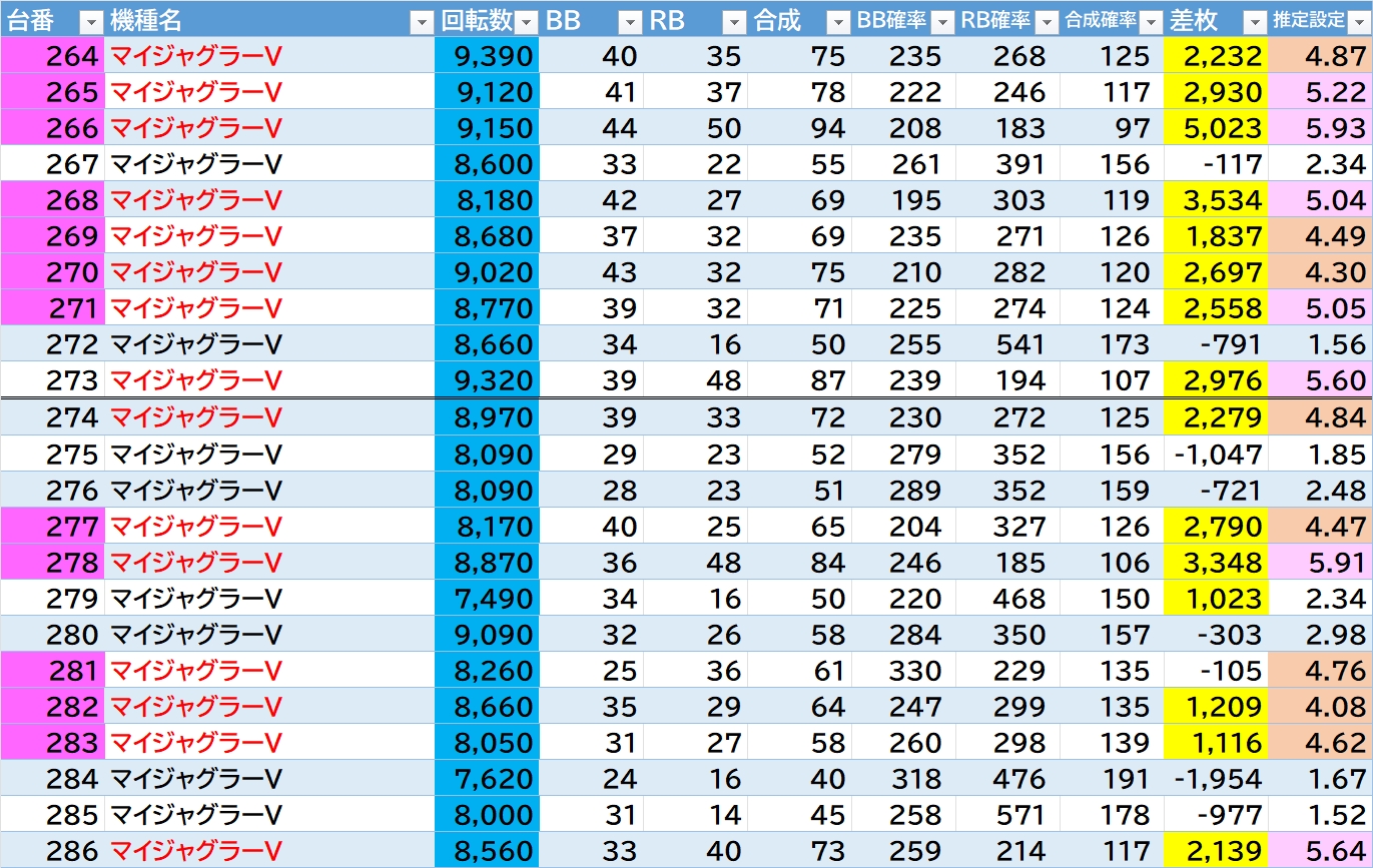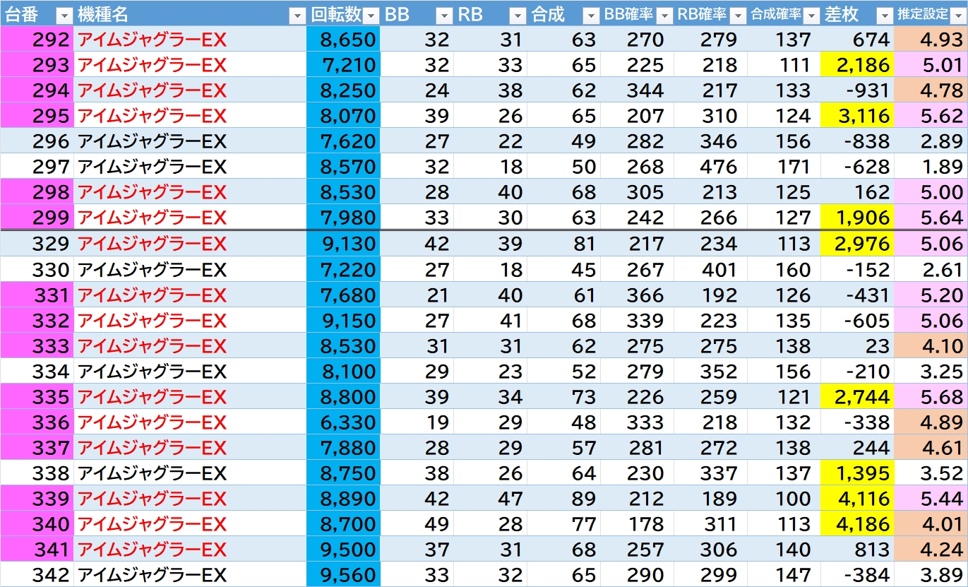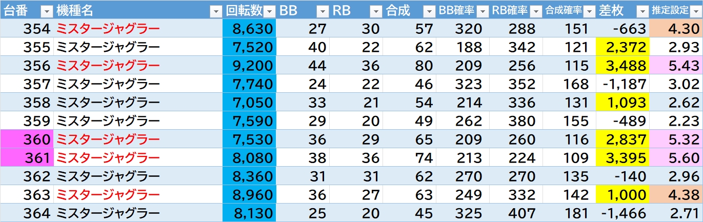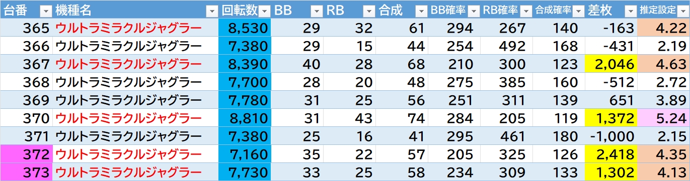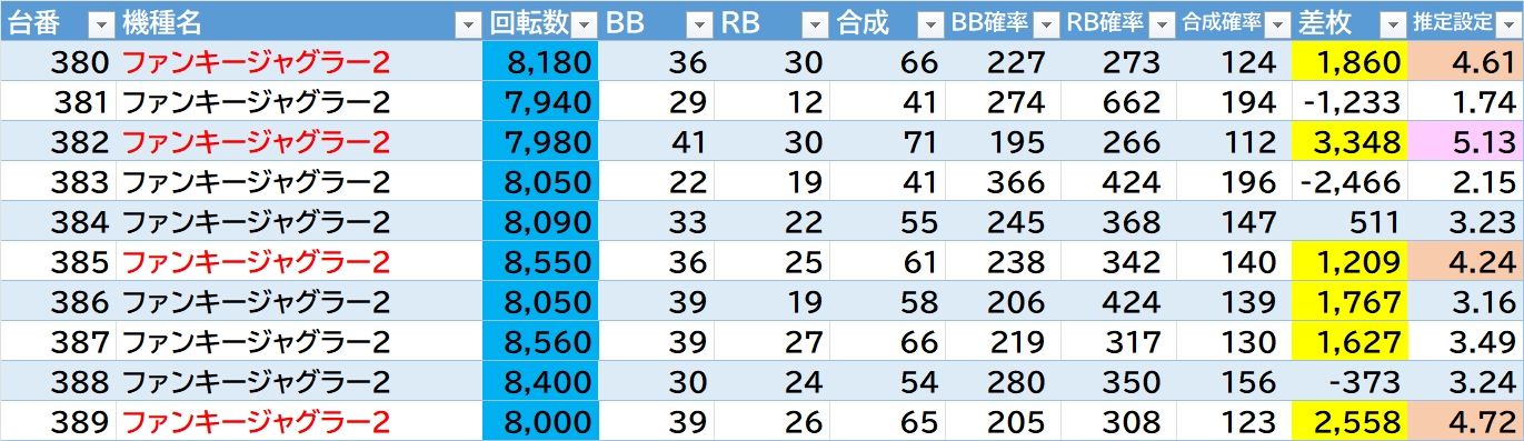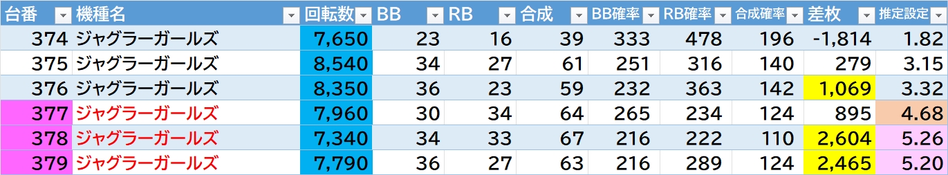 機種名 台番 G数 差枚