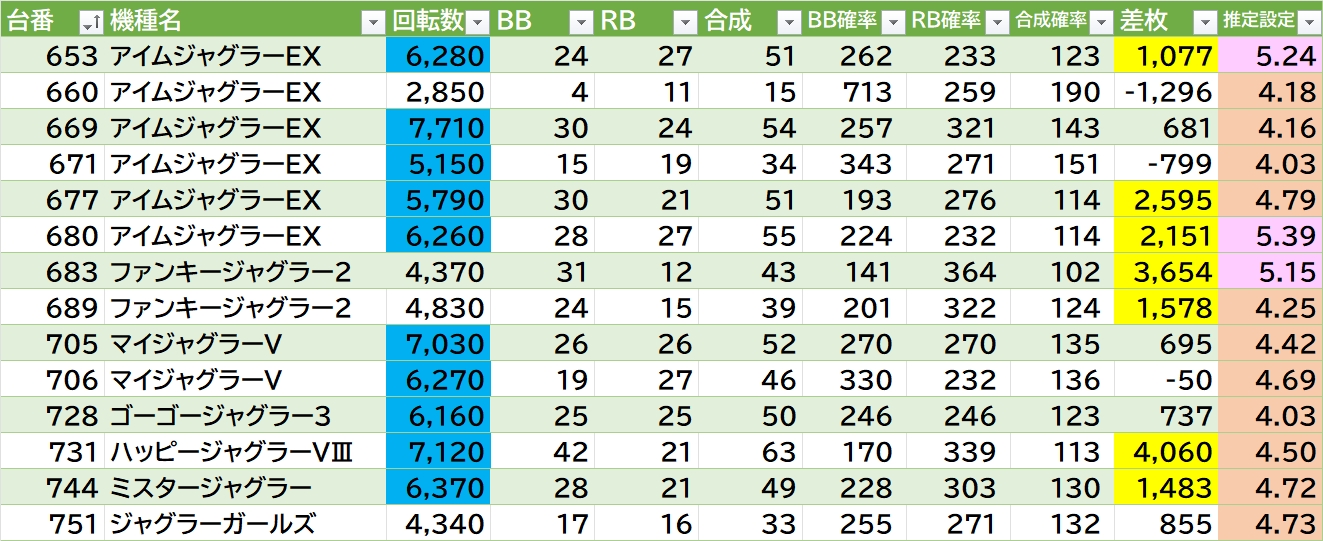 東リベの扱い良さそう👉平均9167G(5/6台)で843・845番が万枚over🎉東京喰種は角側〇。L北斗は865~867番の連番良さげ。新鬼3は633~634番の連番気になる。からサーの306番+18100枚🎉1~2台機種▶①いざ番長が良さげ(614番+17900枚🎉)。②SBJも勝率100%。③1台機種〇(ダリフラ・ガルパン・MFC覚醒・カイジ・ファミスタ・グランベルム)。ほかヴヴヴ・モンキーⅤなど。ジャグラーは120台中14台(11.7%)が推定4以上。