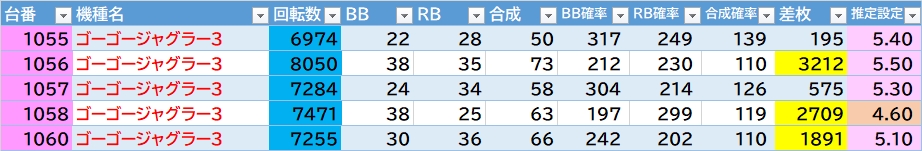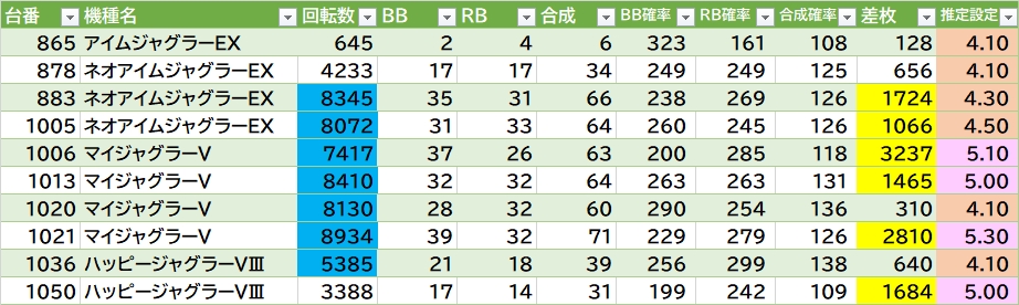 扱いが良さそうな所(角設置が多め)▶①かぐや様は平均7299G 勝率5/5台。②マギレコ(角)は平均4988G 勝率4/4台で角台781番+12000枚🎉③東京喰種(角)は平均5358G 勝率7/10台で角2の213番+13100枚🎉④カバネリ(メダル機バラ)は平均4922G 勝率2/3台。⑤新ハナビ(メダル機バラの角)は3台共合算良き&跨ぎのリヴァイズ776番も〇。⑥ゴージャグ3(角)は推定4以上5/5台で内4台が5以上。あとは東リベ・モンキーⅤ・GE・ライズなど。ジャグラーは72台中12台(20.8%)が推定4以上。マイⅤ・ハッピーにも推定5以上あり。