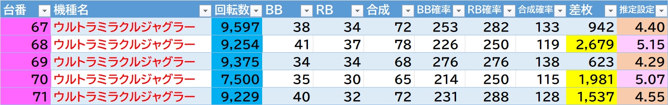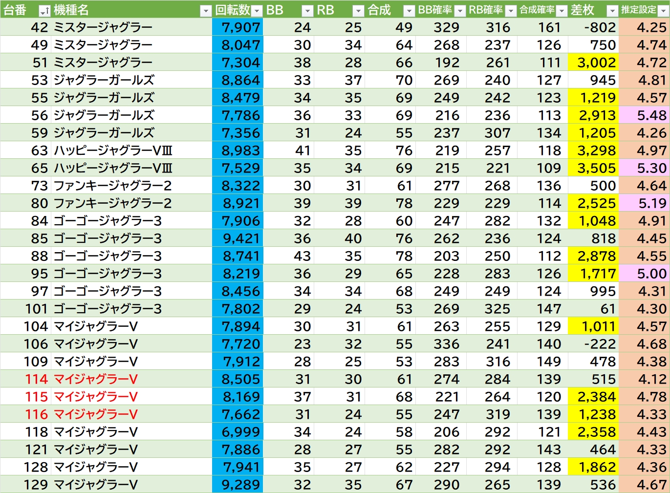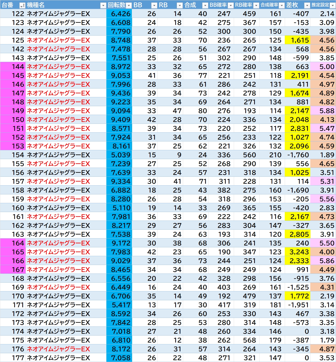 ヴヴヴ・ライズは角側良さそう。防振りは2台共〇。L炎炎・東リベ・GEは半分位気になる。新鬼3は377~378番の連番〇。からサー・銭形5・ToLOVEるに万枚over1台あり🎉ほか東京喰種・モンキーⅤなど。1台機種や機種1の単品っぽい所も多め。ジャグラーは136台中54台(39.7%)が推定4以上。ミラクルが5/5台で内2台が5以上👏ネオアイムは22/40台で144~153・164~167番辺り〇。
