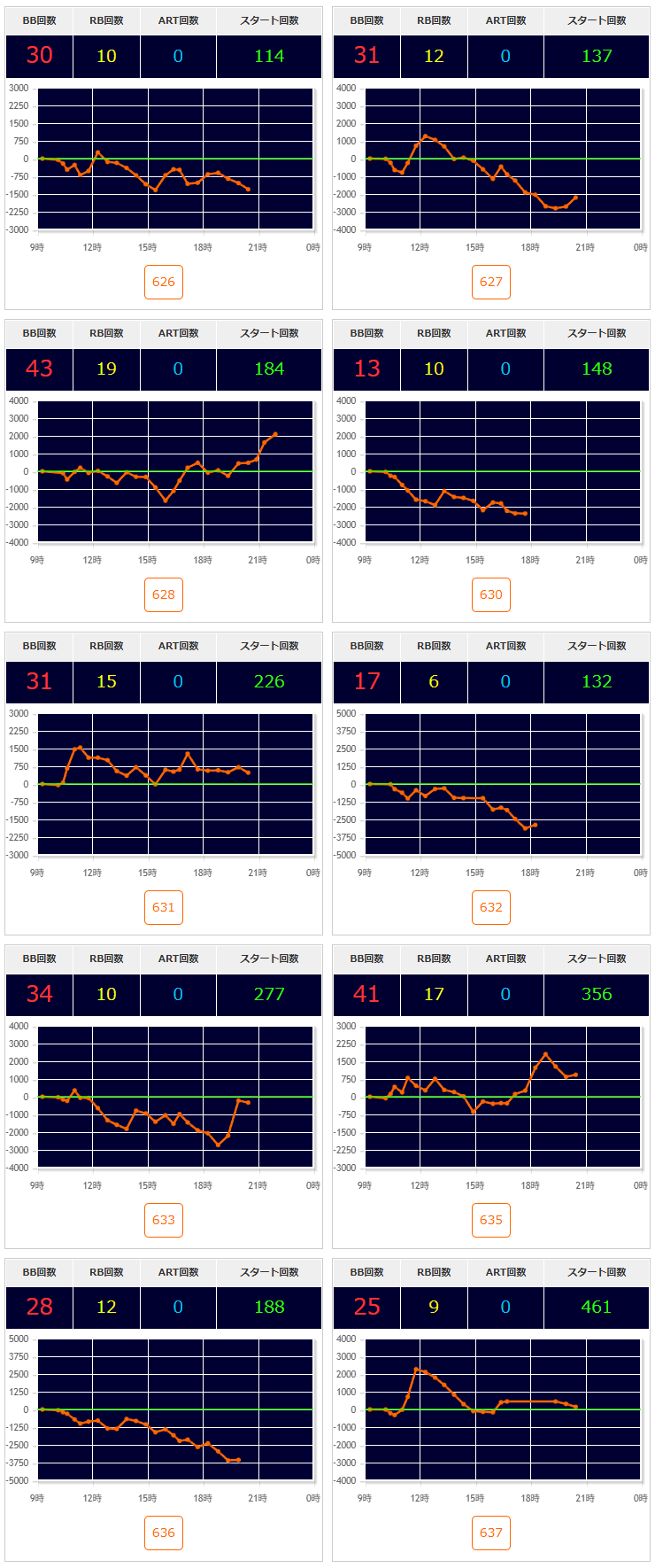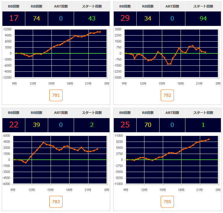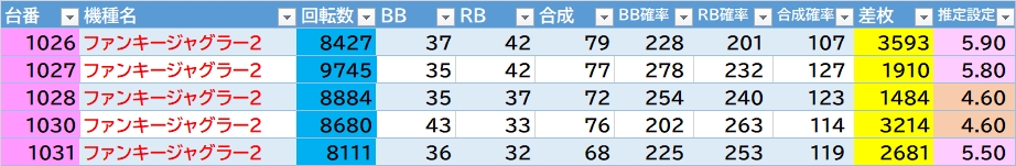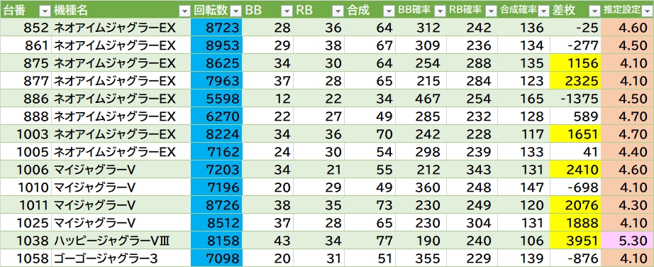 良さそうな所▶①東京喰種 平均5888G(8/10台)で角215番+12900枚🎉②マギレコ 平均4335G(4/4台)で角781番+10600枚🎉③L炎炎 平均7043G(3/3台)。④バラのカバネリ 平均4678G(3/3台)。⑤ファンキー2 推定4以上5/5台(内3台が5以上)。あとは防振りが2/3台〇。かぐや様は1台飛びで差枚良き。新鬼3は角端辺り〇(角625番+13200枚🎉)。GEの603~605番の連番も悪くなさそう。モンキーⅤは1/3位。バラは新ハナビが2/3台で角端台の合算〇&1台機種SEEDが+16000枚🎉ほか東リベ・L北斗・ライズなど。ジャグラーは72台中19台(26.4%)が推定4以上。