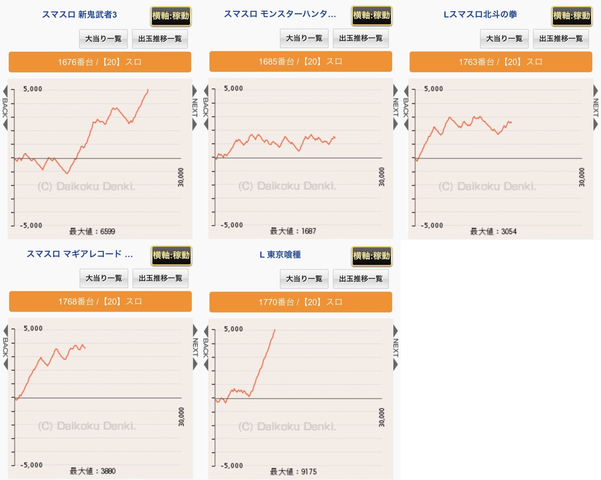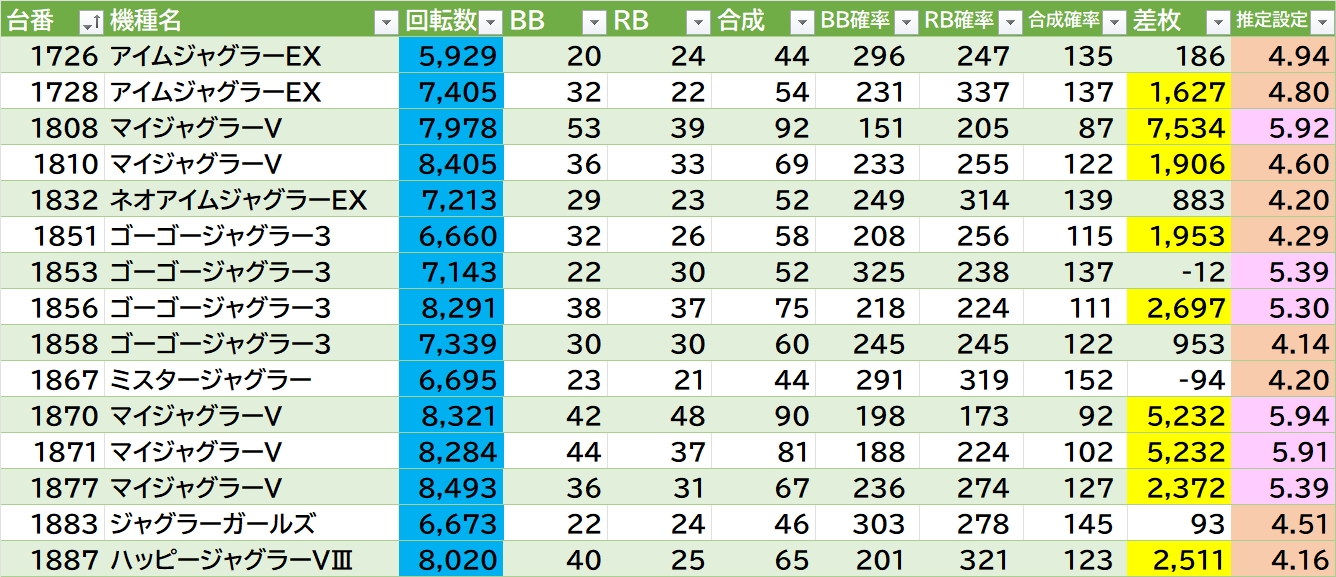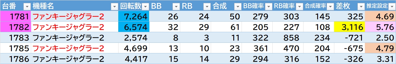 ヴヴヴ2が平均5782G(2/3)で角側2台〇(1672番+18800枚🎉)。1台機種の東京喰種も良さそう。2台機種の新鬼3・ライズ・マギレコは1台気になる。ジャグラーは108台中18台(16.7%)が推定4以上。ファンキー2が3/5台で角側2台〇。マイⅤの1870~1871番は推定5.9の連番👏&1808~1810番も〇。