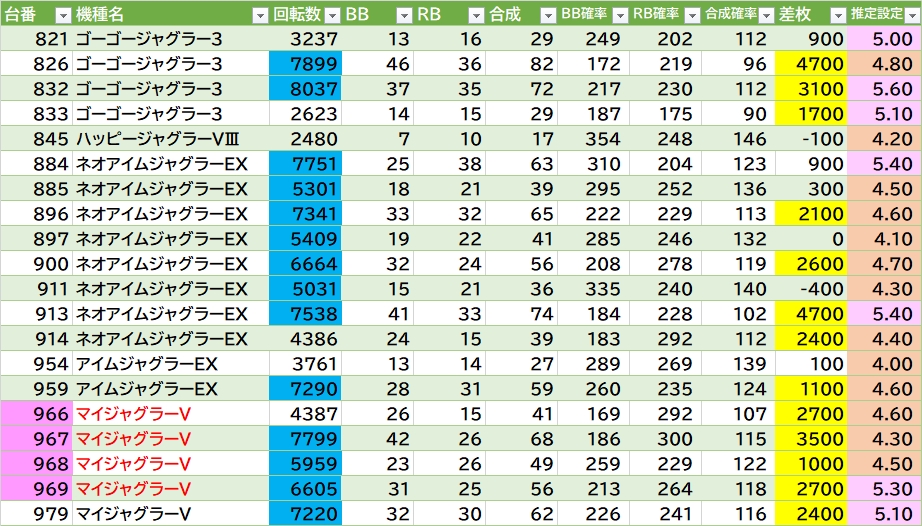 東京喰種・ヴヴヴ2が気になる▶①東京喰種は平均3607G 勝率6/8台。②ヴヴヴ2は平均5321G 勝率3/4台。あとは新鬼3の873~875番の連番が良さそう。ほかモンキーⅤ・L北斗・東リベに単品ありそうな感じ。ジャグラーは100台中20台(20%)が推定4以上。マイⅤの966~969番の連番〇。ネオアイムの角914番辺りも悪くなさそう。ゴージャグ3の832~833番は5以上の連番(833番はG数浅め)。