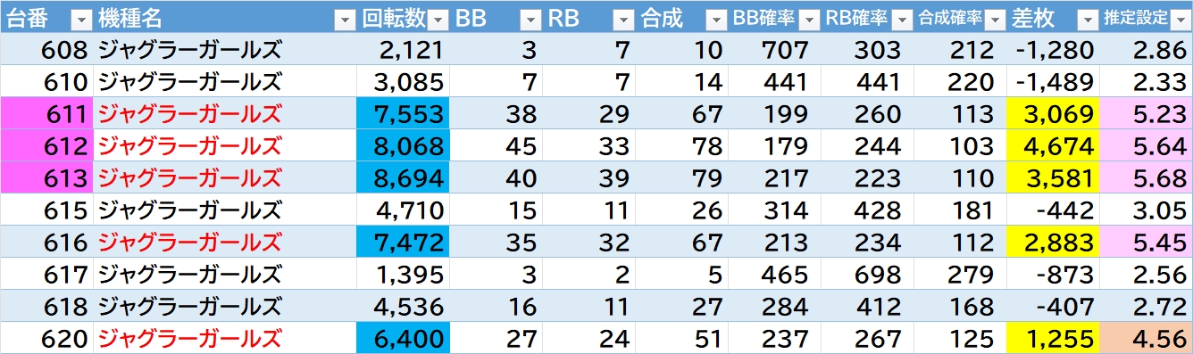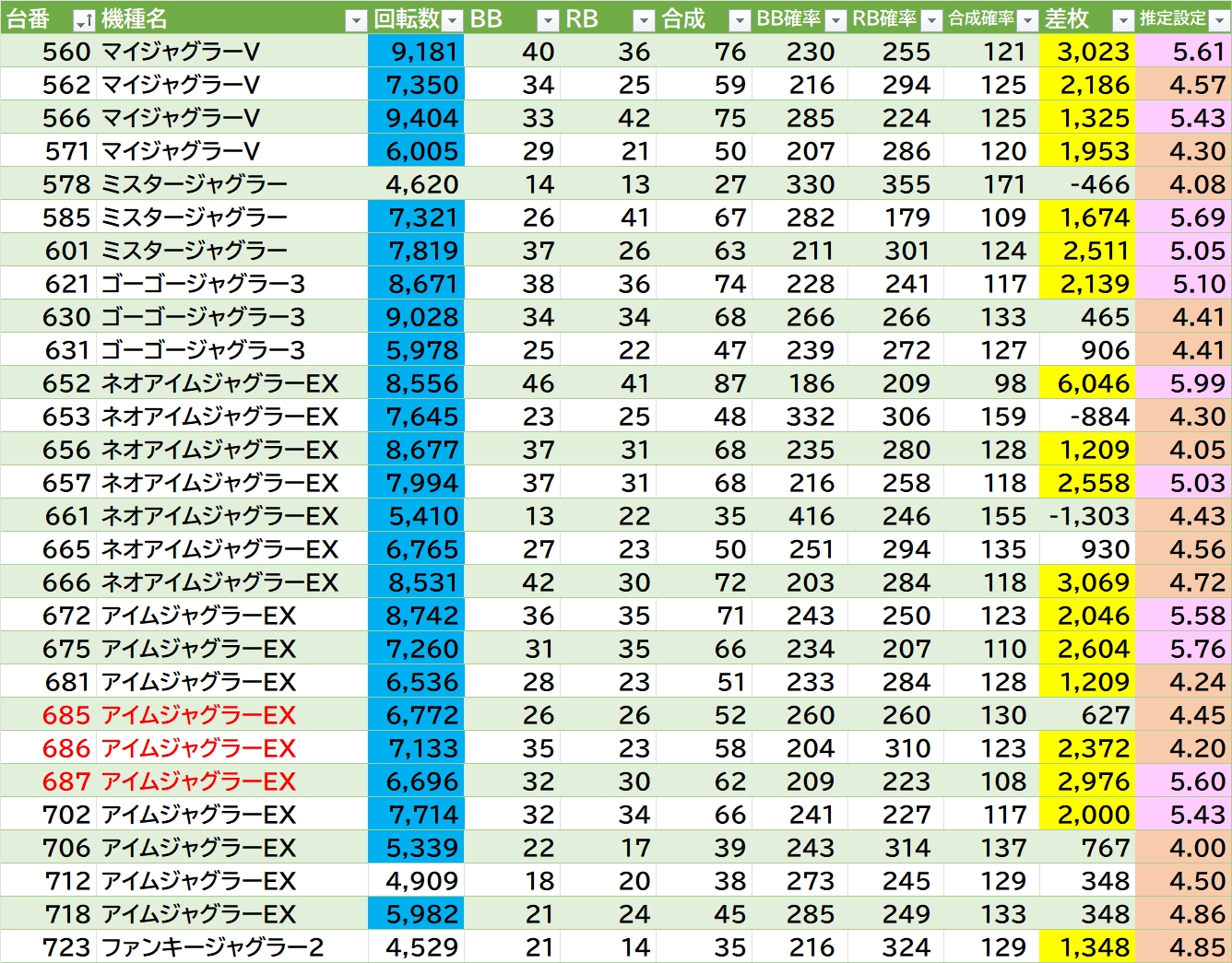 アズレンの扱い良さそう(平均7504G 勝率2/3台)。2台機種のToLOVEるは812番+10600枚🎉&角も悪くなさそう。あとはヴヴヴ2が勝率高め(7/12台)で775番+12300枚🎉東京喰種は半分位〇(角の500番+12000枚🎉)。絶対衝撃Ⅳは内側2台差枚良き(518番+10000枚🎉)。L北斗は1/3位良さそう(両角台〇)。ほかモンキーⅤ・GEなど。マギレコ・東リベ・かぐや様・新鬼3・ヴヴヴに万枚over1台あり🎉ジャグラーは117台中33台(28.2%)が推定4以上。ガールズが5/10台で内4台が5以上(611~613番は連番)👏