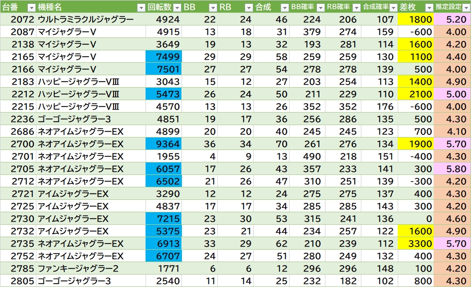 東京喰種が扱い良さそう👏マギレコは1636番側が良さげ(3/6台で万枚over🎉)&2512番側も悪くなさそうな感じ。SBJは平均7092Gと気になる。番長ZEROは角側良さそう。ヴヴヴ2は3118~3137番側がG数高め。ほかライズ・新鬼3・モンキーⅤなど。ジャグラーは200台中22台(11%)が推定4以上。