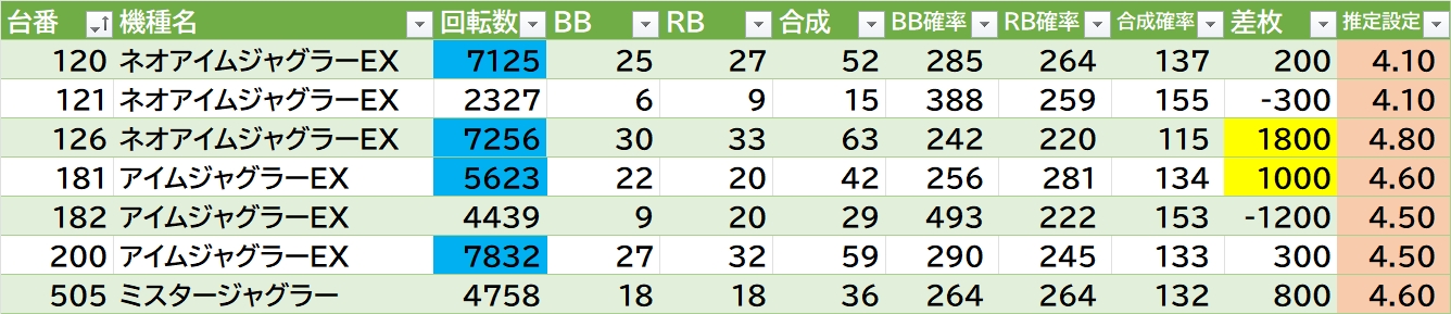ヴヴヴ2・ヴヴヴ・からサーの設置列が扱い良さそう▶①ヴヴヴ2 平均5459G(3/3台)で万枚over2台🎉②ヴヴヴ 平均6682G(8/14台)。③からサー 平均5172G(6/14台)で321番+15300枚🎉あとはモンキーⅤ・DMC5ST・新鬼3の跨ぎも気になる。ほか東リベ・東京喰種など。バラはスマートコーナーに単品ありそう(L炎炎の67番+11000枚🎉)。ジャグラーは90台中7台(7.8%)が推定4以上。