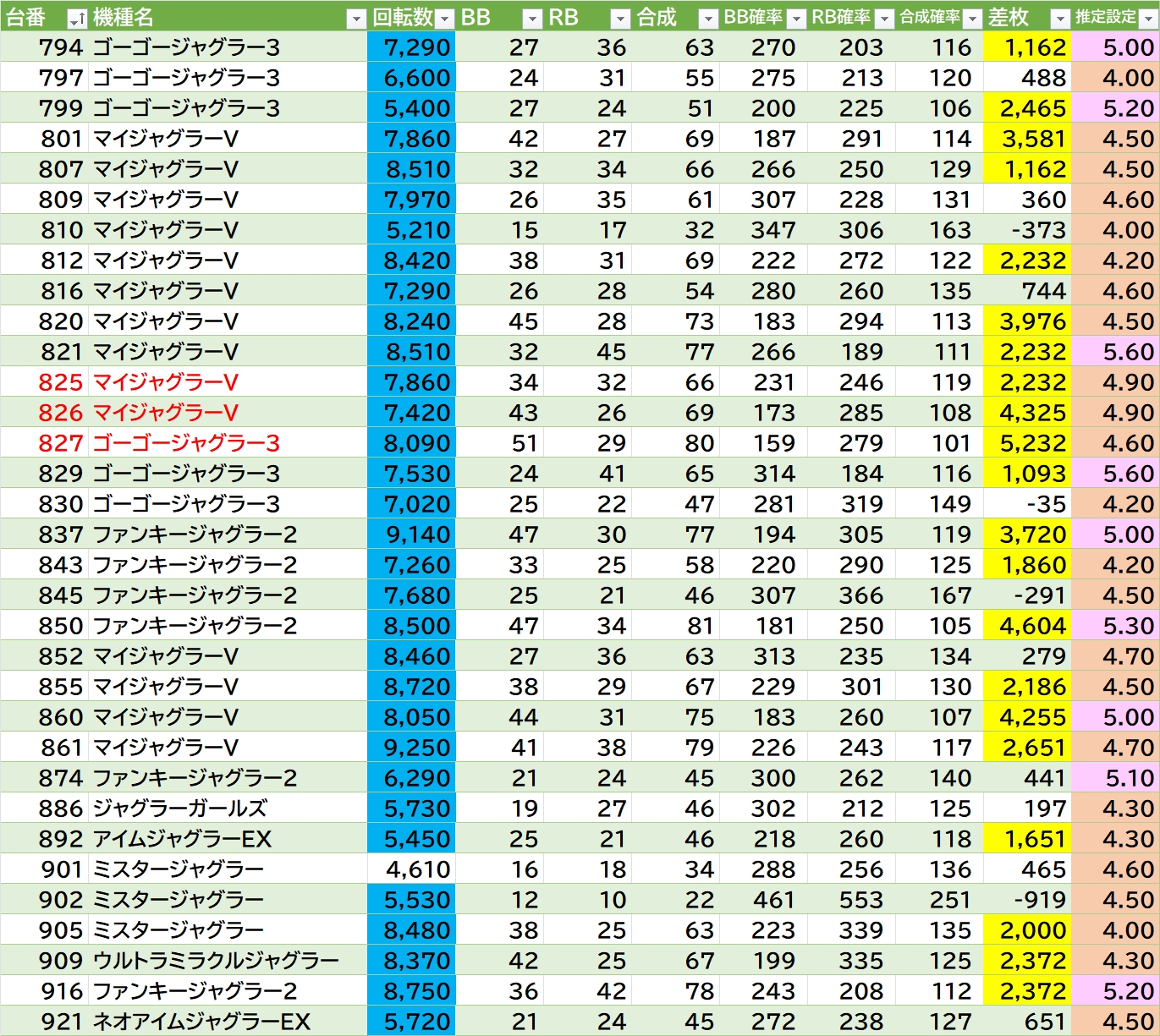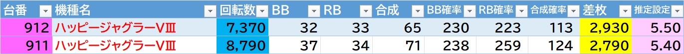 | 機種名 | 台番 | G数 | 差枚 |