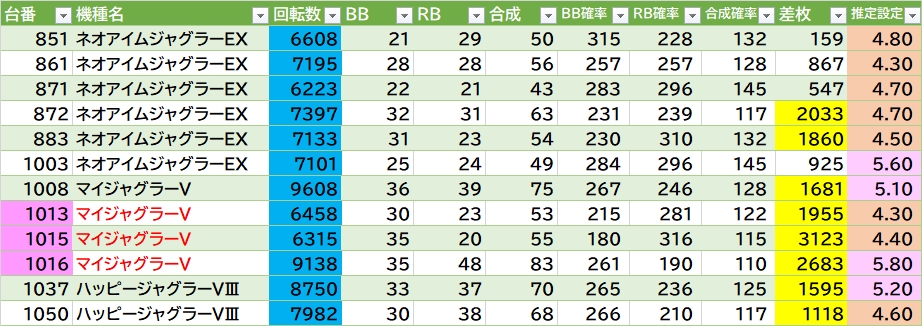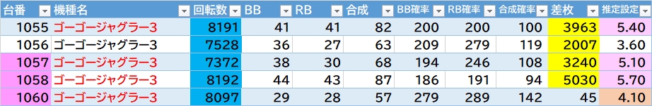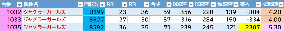 東リベ・番長ZERO・乙女4が良さげ👏▶①東リベ 平均8909G 勝率7/10台。②番長ZERO 平均5311G 勝率3/3台。③乙女4 平均7901G 勝率3/3台。あとはヴヴヴの真ん中辺り気になる。モンキーⅤは850番側の角寄りで単品ありそう。ほか東京喰種・GEなど。新鬼3・転剣に万枚over1台🎉ジャグラーは72台中19台(26.4%)が推定4以上。ガールズは3/3台で内1台が5以上。ゴージャグ3は4/5台で内3台が5以上。マイⅤの1013~1016番の連番〇。