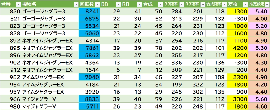 東リベ・新台ヴヴヴ2がG数高め▶①東リベ 平均7549G(2/6台)。②ヴヴヴ2 平均7527G(1/4台)。あとはL北斗の角983番辺り&真ん中991~993番の連番良さそう。東京喰種の角側816~818番も気になる。ジャグラーは100台中14台(14%)が推定4以上。ゴージャス3の820~823番辺り〇。