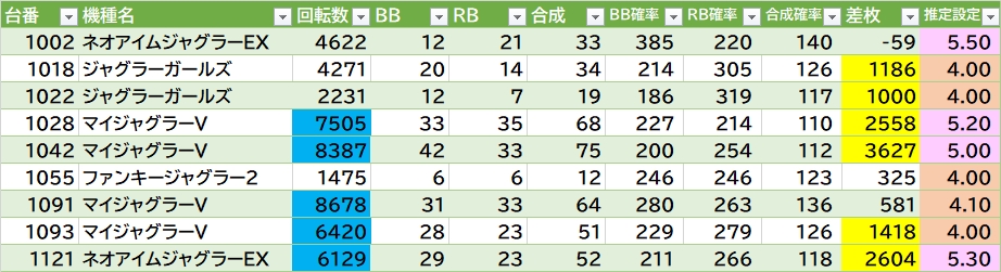 ヴヴヴ2が気になる👉平均6659G 勝率5/6台で1141番+11500枚🎉あとはレイアウト変更台の扱いも良さげ。モンキーⅤは片側寄りで単品ありそう。乙女4は各角台が〇。ほか機種1っぽい所など。ジャグラーは88台中9台(10.2%)が推定4以上。