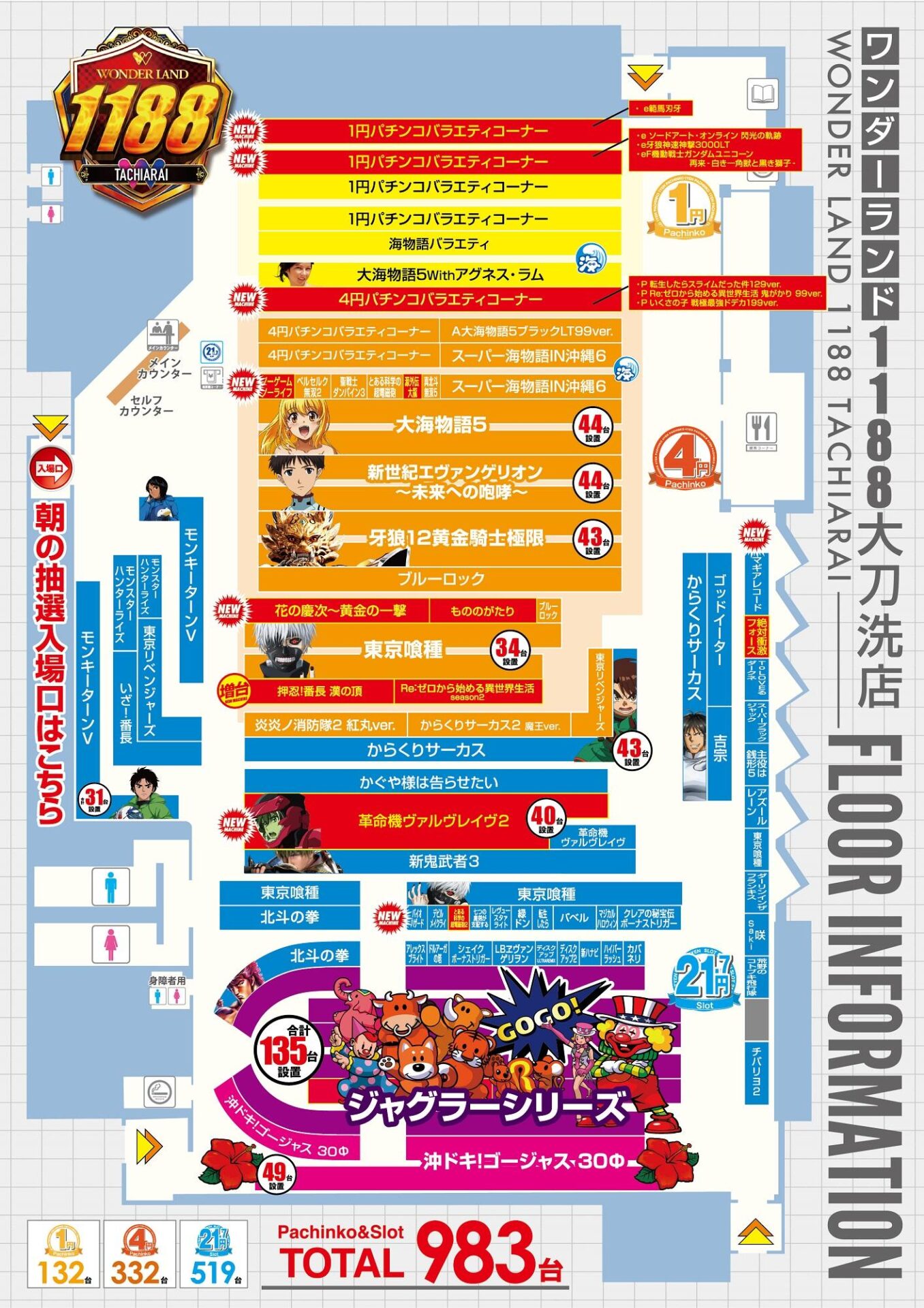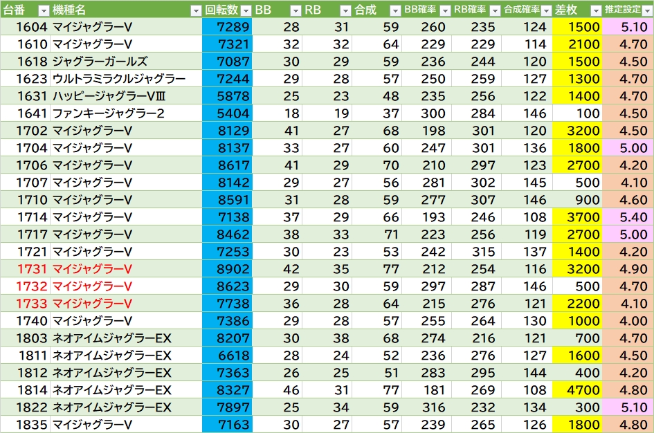 いざ番長の扱い良さそう👉平均4792G(7/10)で万枚over2台🎉あとはヴヴヴ2がG数高め(平均6265G 勝率18/40で万枚over2台🎉)。新鬼3は片角1425番辺り&真ん中1414~1415番の連番〇。からサーの1238~1242番辺りも悪くなさそう。ToLOVEるver.8.7・銭形5に万枚over1台あり🎉ジャグラーは135台中24台(17.8%)が推定4以上。
