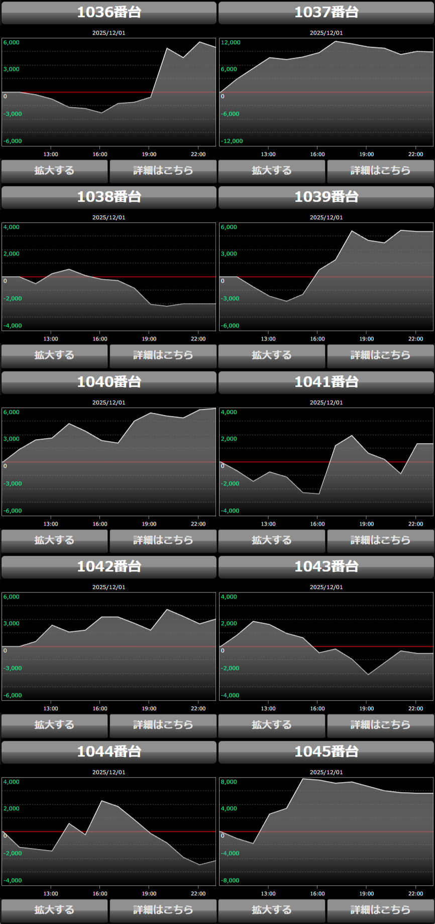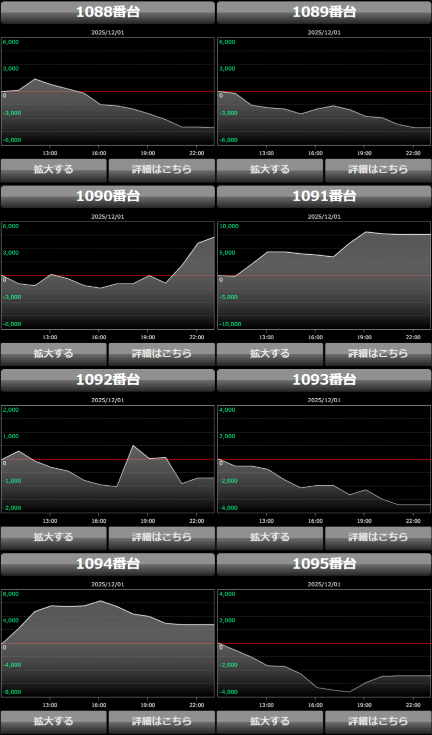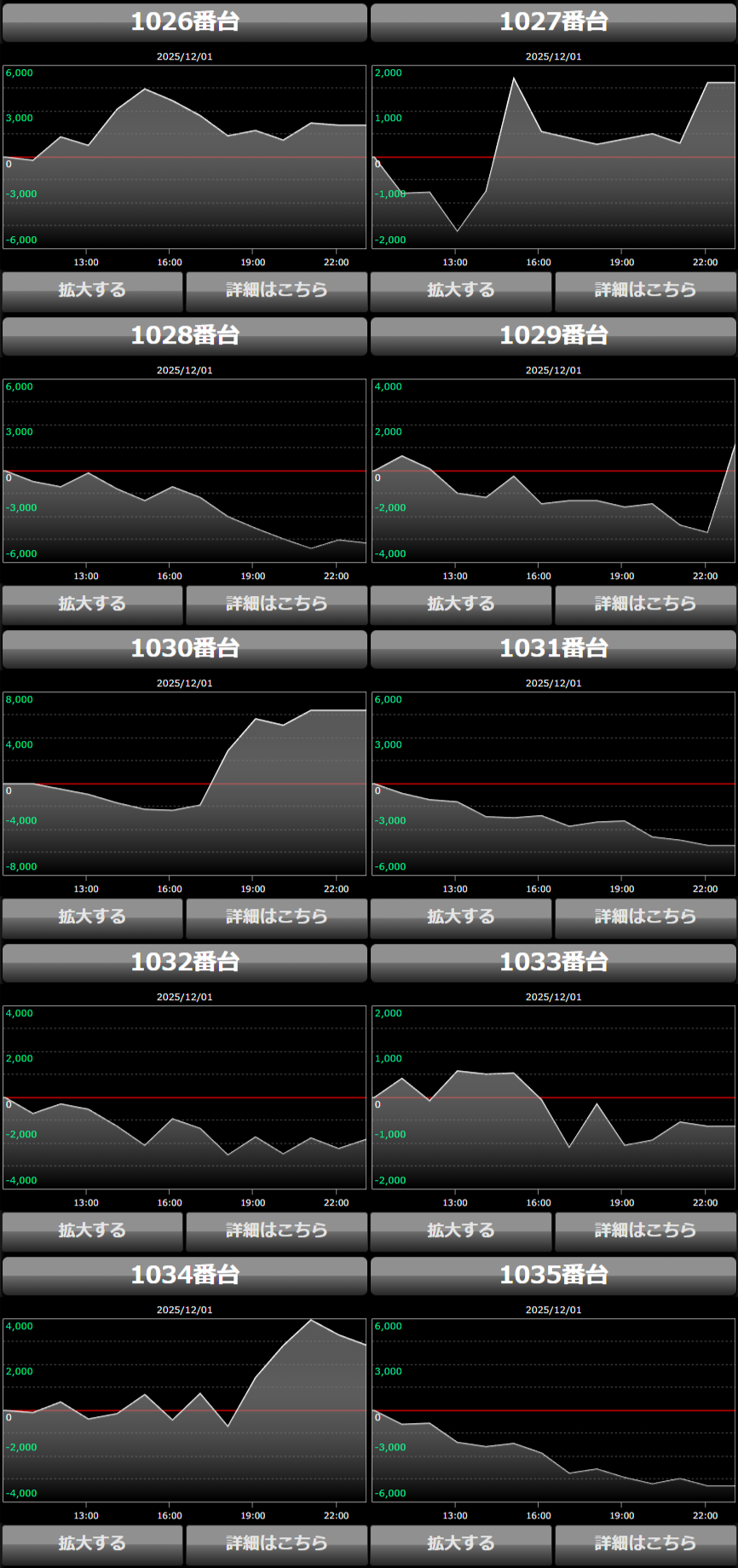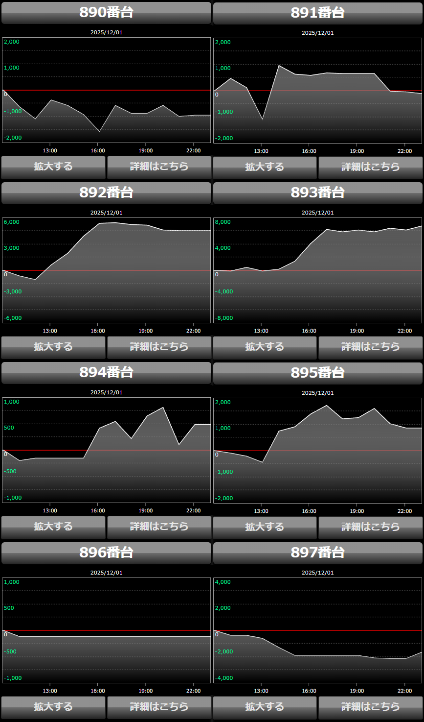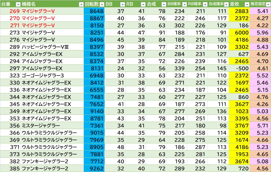 ヴヴヴ2が全体的にG数高め(平均6897G 勝率12/20台)。東リベは1/3位気になる(万枚over2台🎉)。東京喰種は1090~1092番の連番〇。マギレコ・GEは角付近が悪くなさそう。いざ番長は989~990番の連番で万枚overあり🎉ほかドラハナ・モンキーⅤ・L北斗など。L炎炎・かぐや様・チバリヨ2にも万枚over1台あり🎉ジャグラーは126台中23台(18.3%)が推定4以上。マイⅤの269~271番〇。