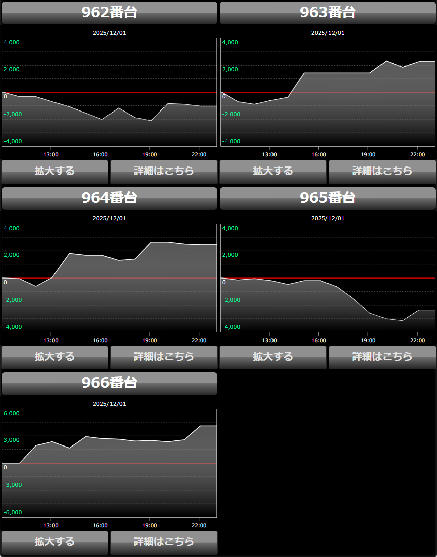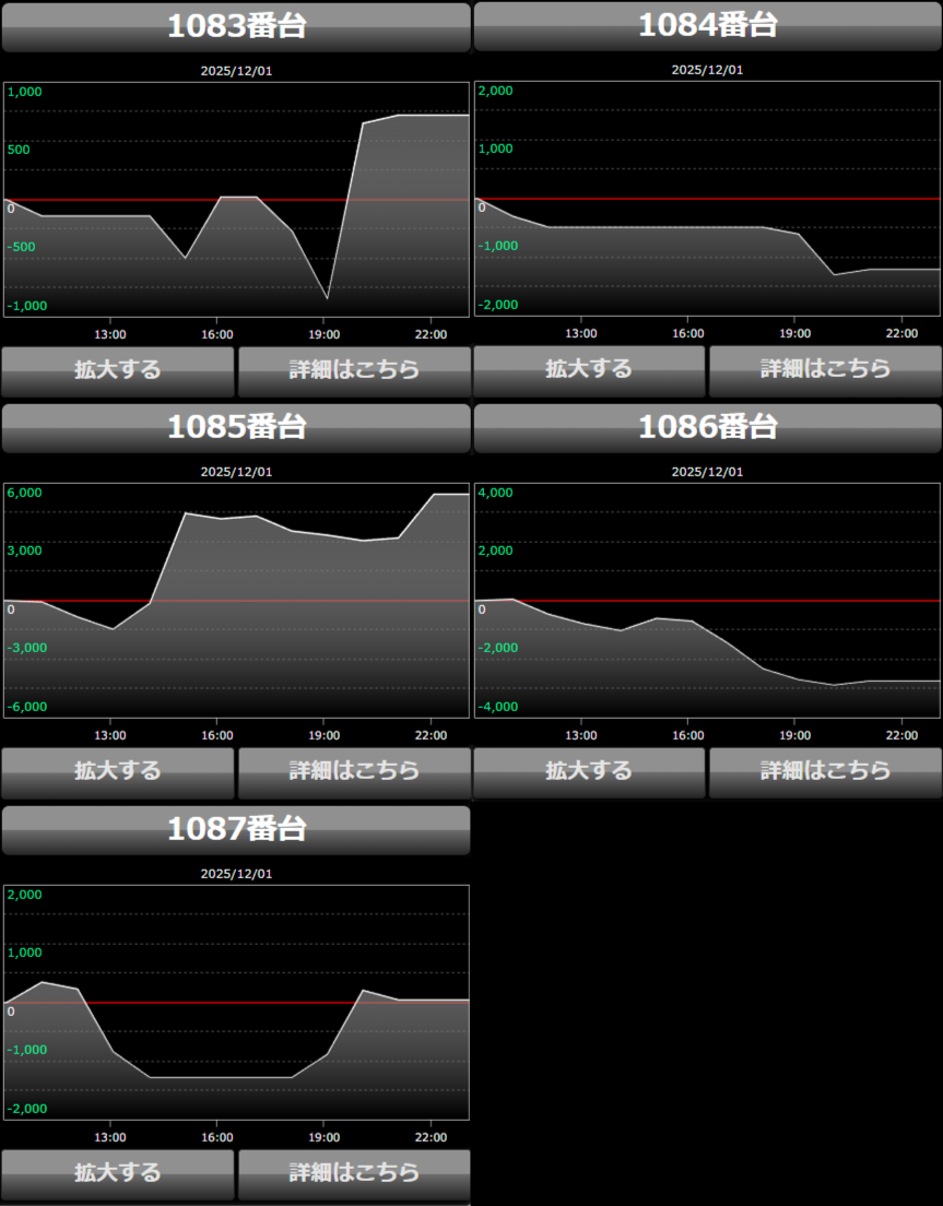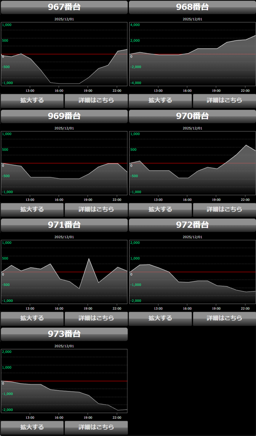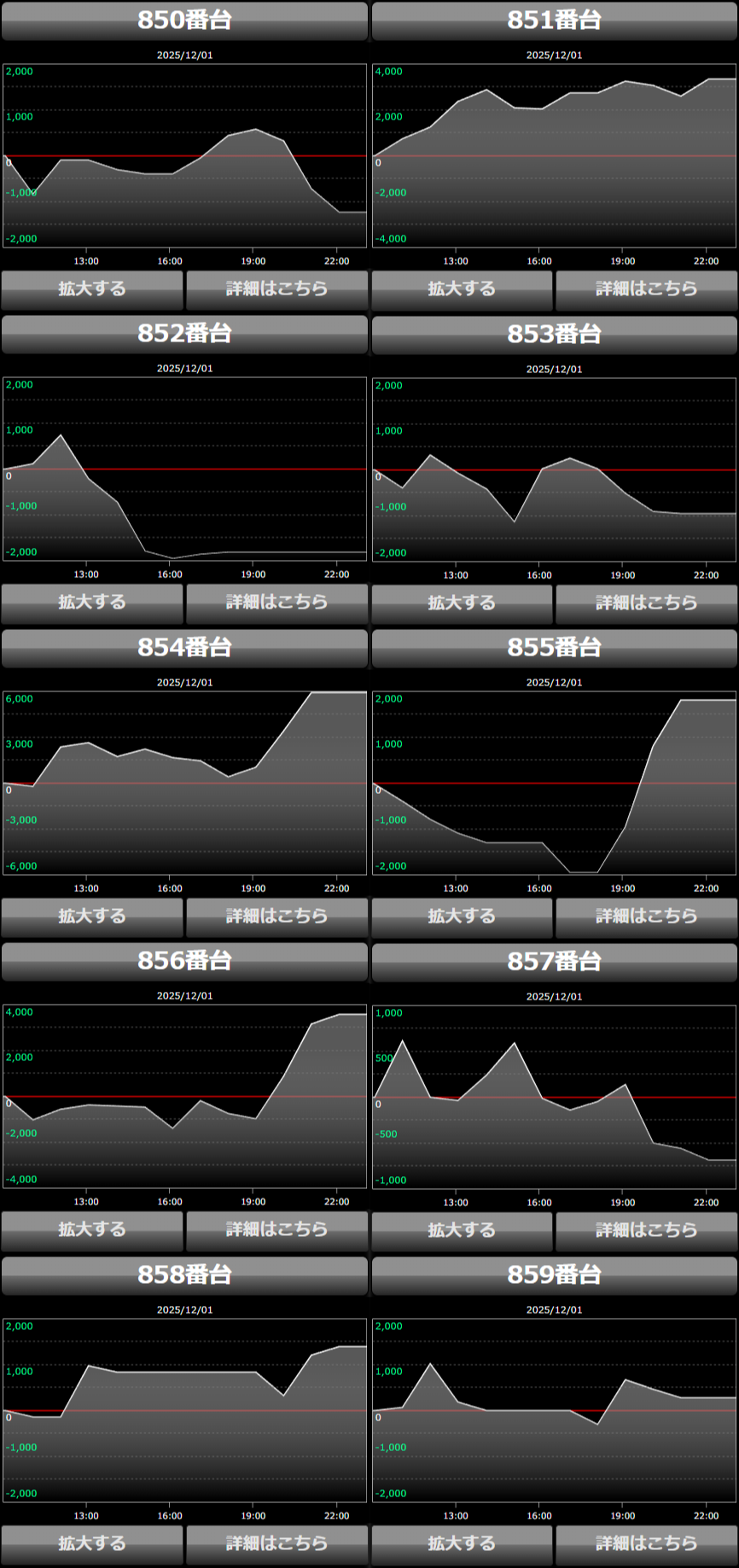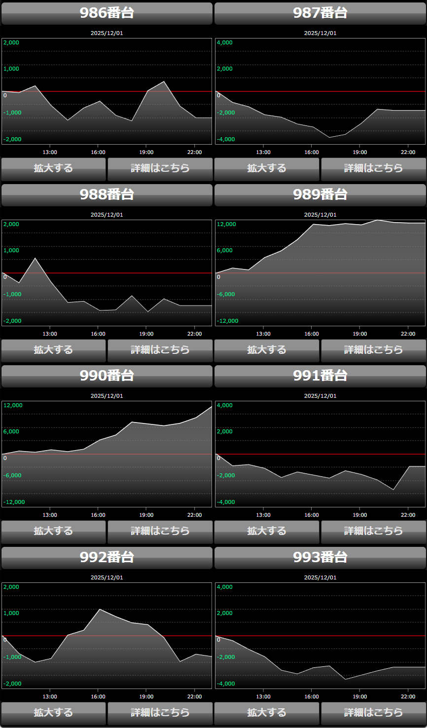 ヴヴヴ2が全体的にG数高め(平均6897G 勝率12/20台)。東リベは1/3位気になる(万枚over2台🎉)。東京喰種は1090~1092番の連番〇。マギレコ・GEは角付近が悪くなさそう。いざ番長は989~990番の連番で万枚overあり🎉ほかドラハナ・モンキーⅤ・L北斗など。L炎炎・かぐや様・チバリヨ2にも万枚over1台あり🎉ジャグラーは126台中23台(18.3%)が推定4以上。マイⅤの269~271番〇。