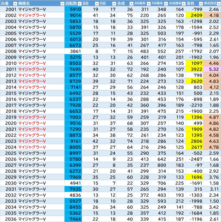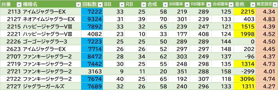 からサーは1138~1144(角)番辺りが良さそう(1141~1142番の連番で万枚over🎉)。東京喰種・ライズは半分位気になる。東リベは真ん中1103~1109番辺り〇。新鬼3・モンキーⅤの端側辺り〇。吉宗は1129~1130番の連番〇。ヴヴヴ2に3台・かぐや様に2台万枚overあり🎉1台機種のバーニングエクスプレスも万枚over🎉ジャグラーは137台中23台(16.8%)が推定4以上。マイⅤが1/3位でかたまってそうな感じ。