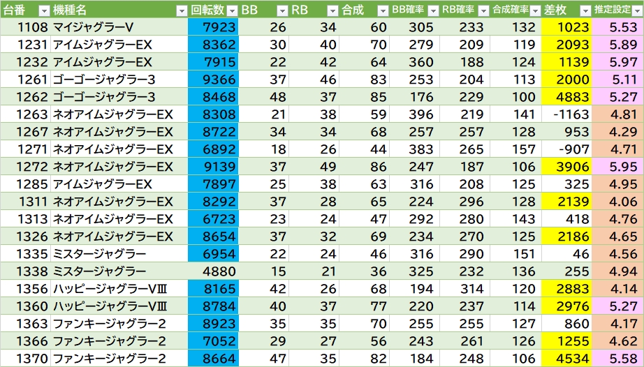 2台機種の防振り・新鬼2が良さそう👏3台機種の化物語も気になる(平均8982G 勝率1/3台)。バイオ5・乙女4は2/3台〇(乙女4の877番+10300枚)。東京喰種の扱いも〇(平均8392G 勝率6/10台で817番+10400枚🎉)。GE&マギレコ並び・東リベ・からサーは1/3位〇。連番で気になる所あり▶①新鬼3の728~735番。②L北斗の762~765番。③ヴヴヴ2の1178~1200番辺り。ほかライズ・かぐや様など。吉宗・銭形5・いざ番長・チバリヨ2プラスに万枚over1台🎉ジャグラーは115台中20台(17.4%)が推定4以上。アイムの1231~1232番・ゴー3の1261~1262番は5以上の連番。末尾【5】👉1台平均+1338枚 勝率27/44台(61.4%) ジャグ推定4以上2/14台(14.3%)。