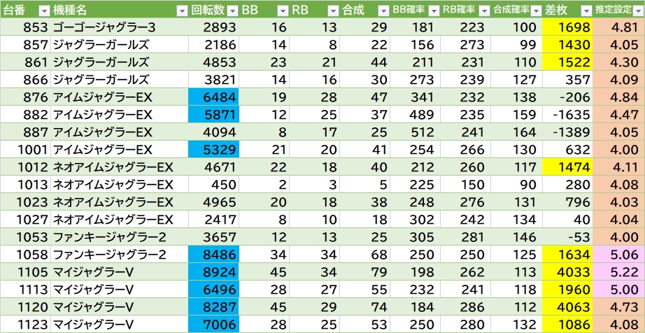 モンキーⅤの688~700番の連番〇。機種跨ぎの連番で気になる所▶新鬼3&東リベ・DMC5ST&SBJ・バラのL炎炎&マンキン。いざ番長の661番+12500枚🎉ジャグラーは100台中18台(18%)が推定4以上。ファンキー2・マイⅤに推定5以上の台あり。