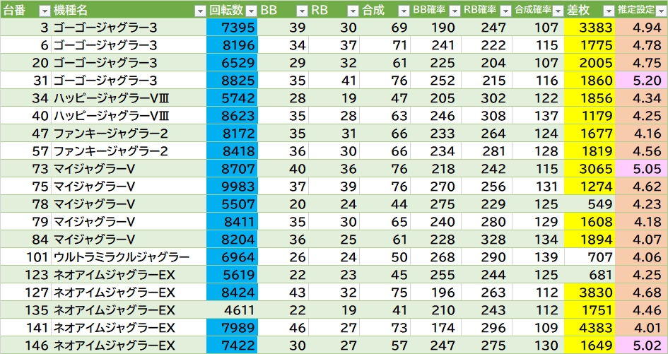 | ゴーゴージャグラー3 | 19 | 5,678 | -132 |