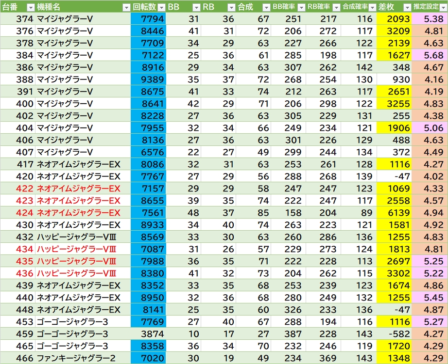 化物語・GEが気になる▶①化物語 平均8354G 勝率3/5台。②GE 平均7906G 勝率3/6台(544番+17100枚🎉)。あとはヴヴヴ2の角付近が良さそう(353番+16900枚🎉)。ヴヴヴは1台飛びで差枚良き(366・368番が万枚over🎉)。新ハナビは484~485番の連番〇。モンキーⅤは半分位〇(530番+10800枚🎉)。北斗の角295番辺り・東京喰種の真ん中599~602番辺りも〇。ほか東リベ・かぐや様など。ToLOVEるにも万枚over1台あり🎉ジャグラーは103台中29台(28.2%)が推定4以上。ハッピーは4/8台(435~436番がⅤ以上の連番)。