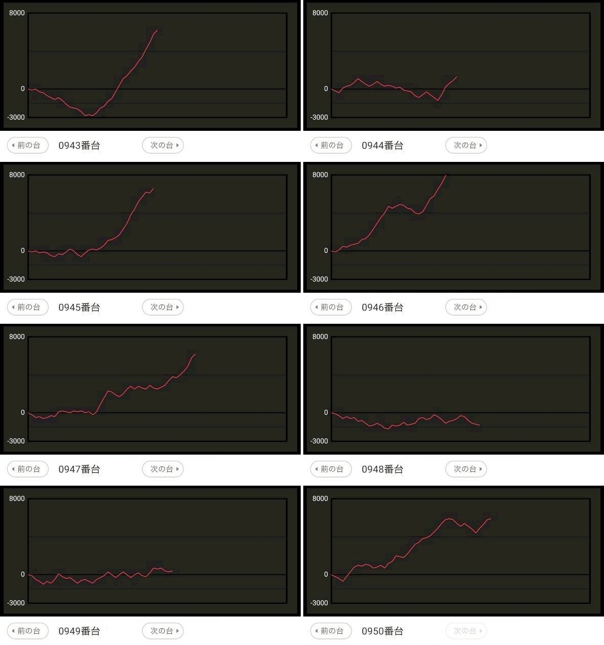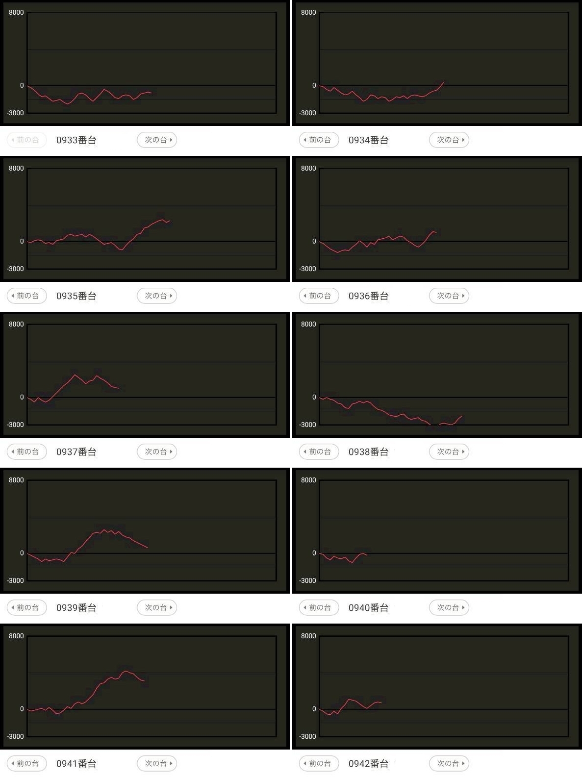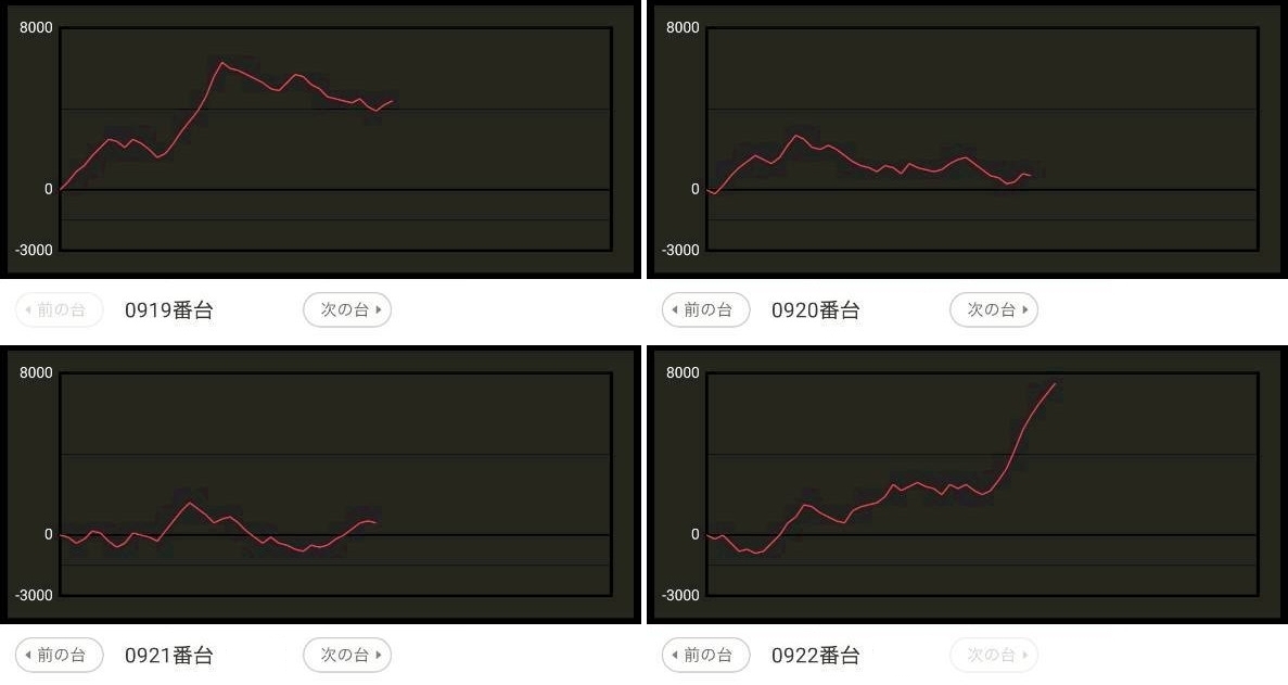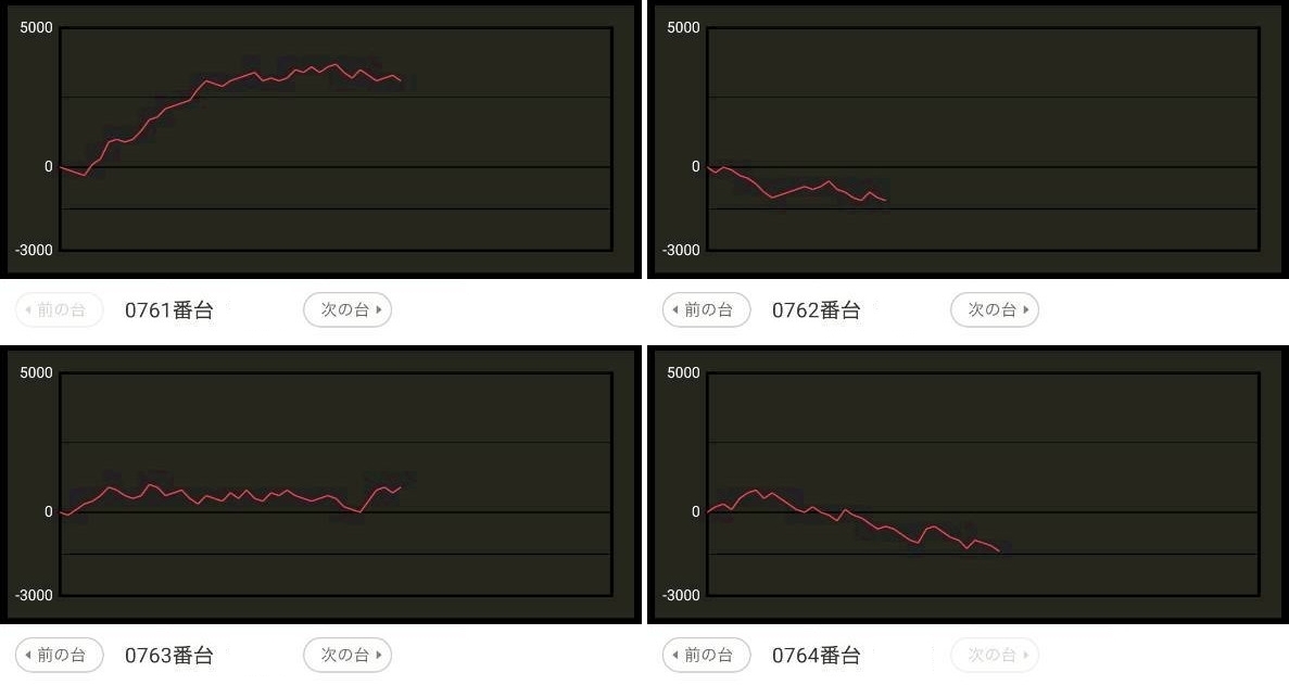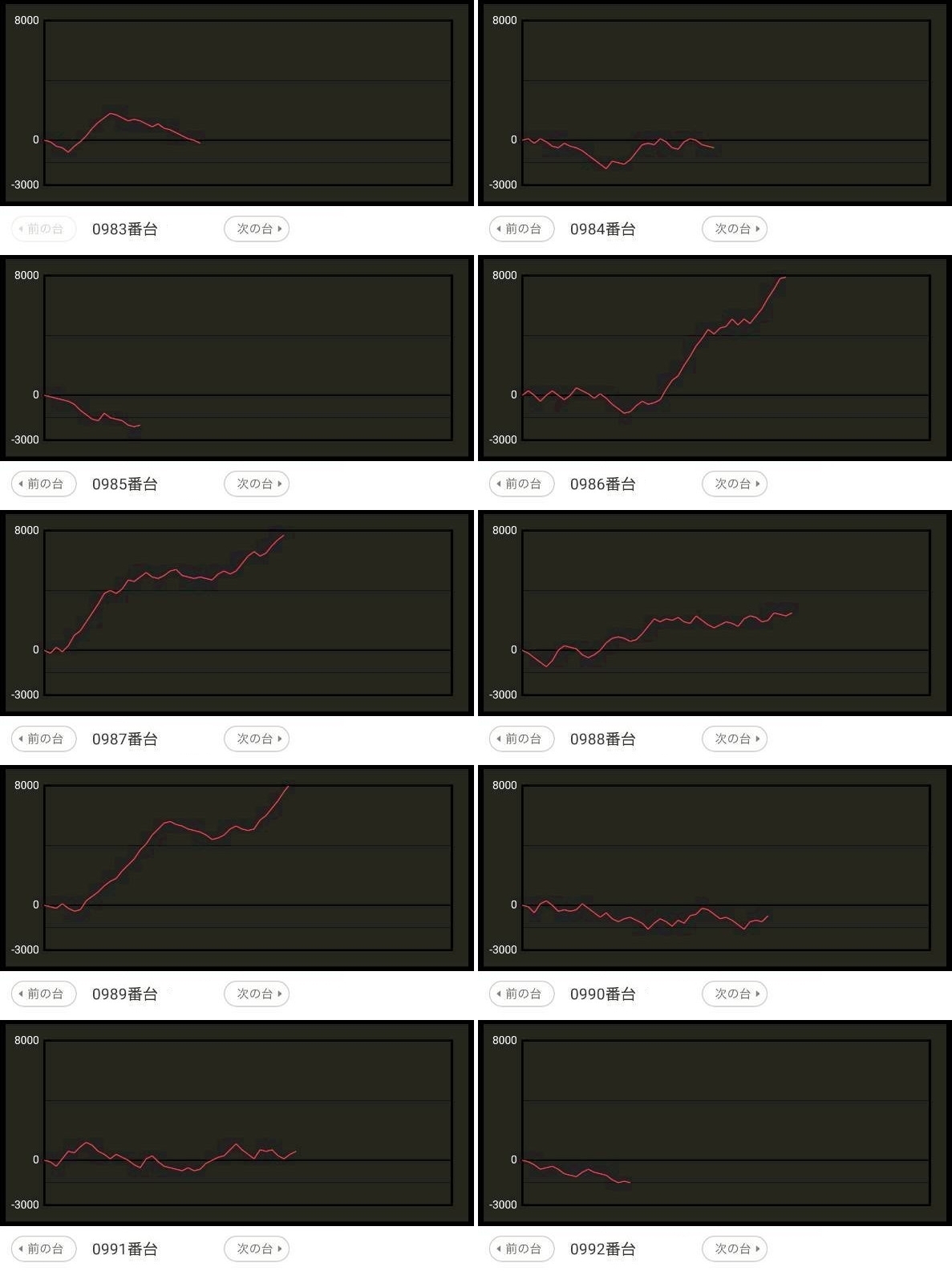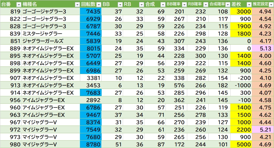かぐや様が気になる👉平均6976G 勝率3/4台。北斗・モンキーⅤに連番で良さそうな所あり▶①北斗の986~991・994~999番。②モンキーⅤの945~950番。あとはヴヴヴ2・L秘宝伝・いざ番長が角側の勝率高め。新ハナビ・化物語は1台飛びで〇。ほか東京喰種・新鬼3など。ジャグラーは100台中19台(19%)が推定4以上。
