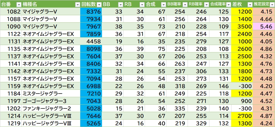 機種名 台番 G数 差枚