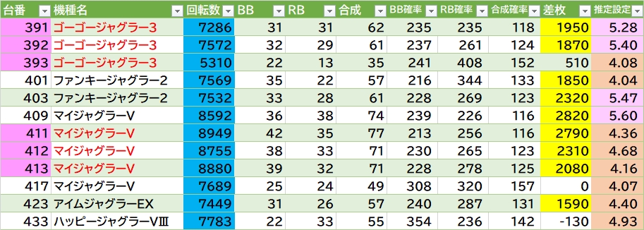 かぐや様が勝率高め(7/11台)で182番+10000枚🎉ヴヴヴも片側の勝率高い&万枚over2台🎉乙女4・からサー・東リベは半分位気になる(からサーは角端台が万枚over🎉)。ヱヴァは224番側の端側〇。ほかGE・マギレコ・1台機種など。モンキーⅤ・新鬼3・ヴヴヴ2・SBJ・L北斗に万枚over1台あり🎉ジャグラーは66台中12台(18.2%)が推定4以上。ゴージャグ3・マイⅤに連番あり。末尾9の差枚良き👉1台平均+3459枚 勝率19/28台(67.9%) ジャグ推定4以上1/7台(14.3%)で万枚over5台🎉ジャグは末尾3が〇(5/7台)。