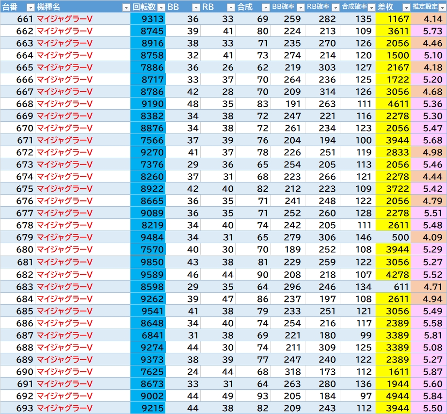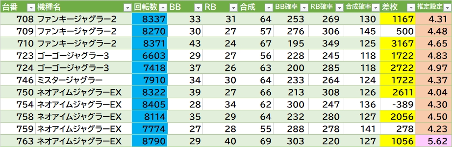 マイⅤが全台推定4以上(23/33台が5以上👏)👉平均8712G 勝率100%。あとは銭形5の扱いも良さそう。東リベは半分位〇。新鬼3は角辺り〇(503番+17900枚🎉)。モンキーⅤは1/3位。連番で気になる所あり▶①ライズの528~529番。②GEは537~538番。③からサーの643~645番。ほかL北斗・ヴヴヴ2・LBヱヴァなど。ジャグラーは103台中44台(42.7%)が推定4以上。